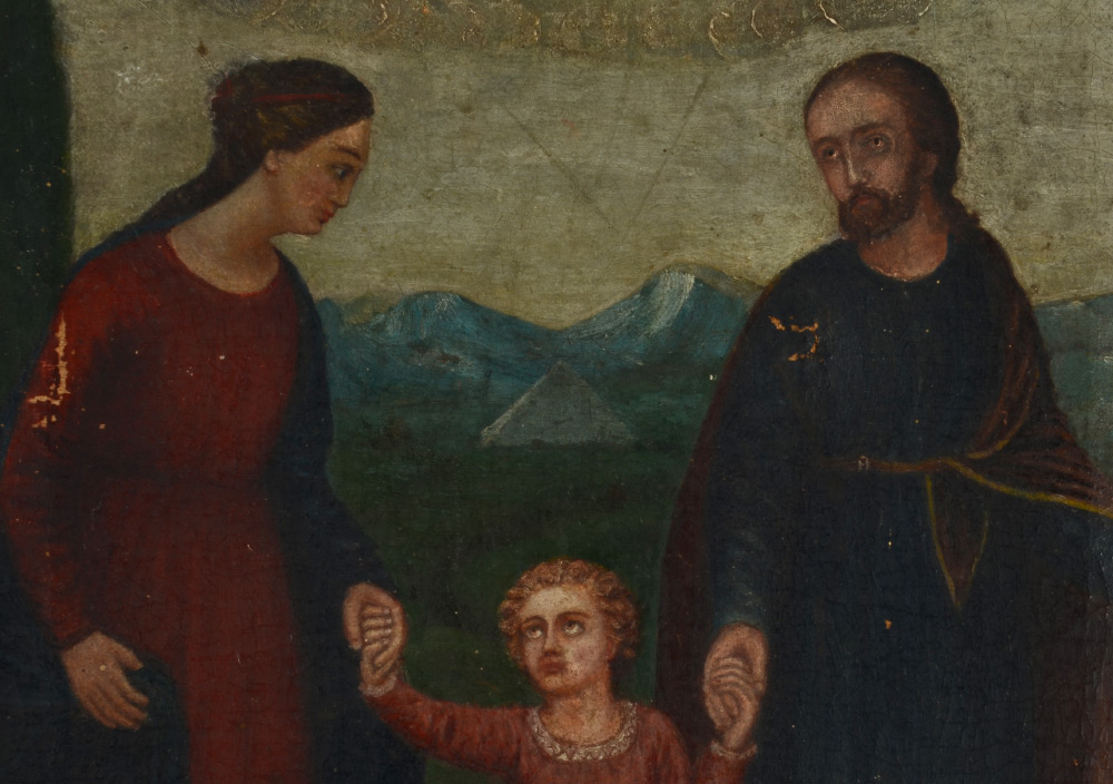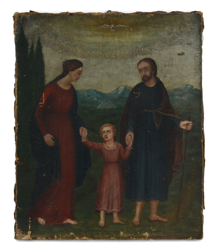 EARLY FOLK NAIVE RELIGIOUS PAINTING: Oil/Canvas, 16'' x 13 1/2'', no visible signature, unframed.