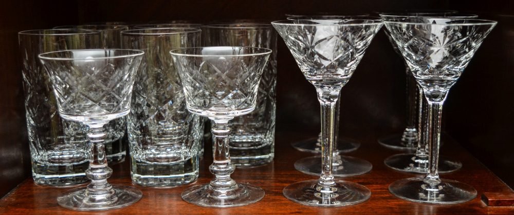 ELEGANT CUT CRYSTAL STEMWARE: Approx. 53 pieces to include 13 goblets (8 1/2''), 8 champagne sherbets (6 1/2''), 8 wine (5''), 8 wine 4 3/4''), 8 wine (4 1/2'') and 8 tumblers (4 3/4'').