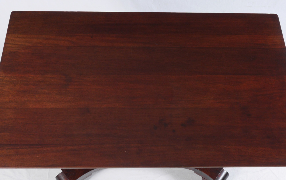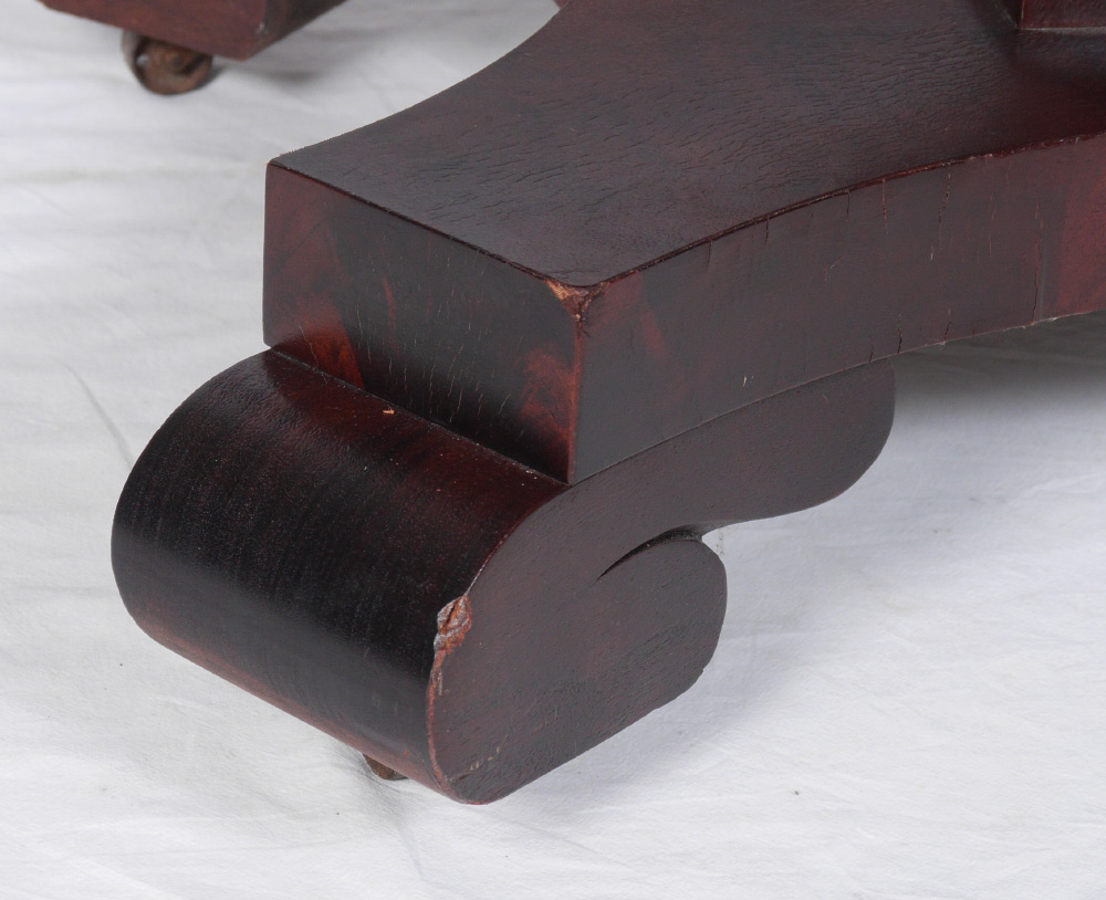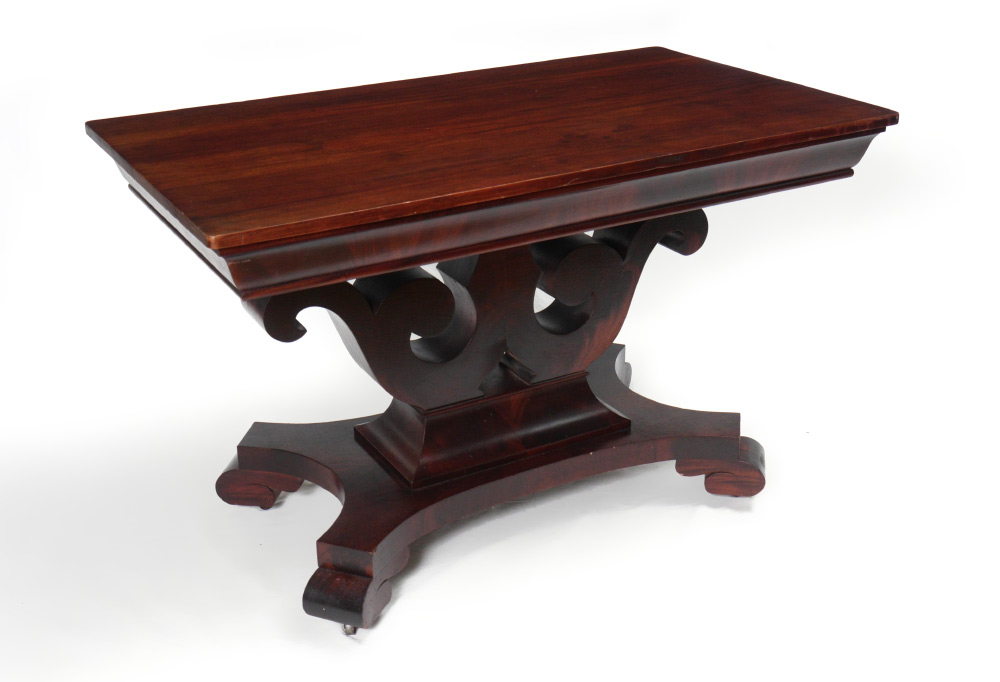 MAHOGANY EMPIRE FOYER TABLE: Planked top, shaped skirt. Empire style shaped pedestal base, all on castors. Overall measures 30 1/4'' h. x 48'' x 28 1/4''.