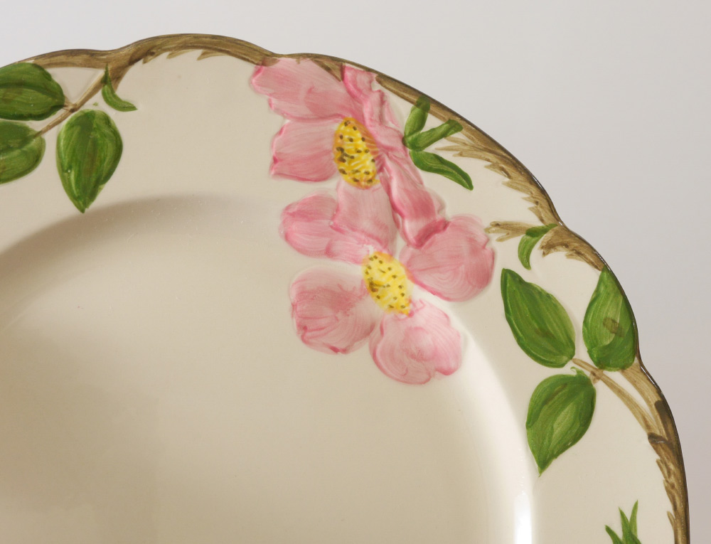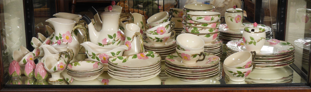 FRANCISCAN DESERT ROSE DINNERWARE: Approx. 60 pieces to include coffee pot (0''), the 6'' and 7'' jugs, marmalade jar, gravy, 4 candle holders, 3 rose shaped shakers, creamer, covered sugar and 6 dinner plates (10 1/2''), 6 salad plates, 9 bread plates, 6 cups and 6 saucers, 4 dessert bowls, 5 crescent dishes.