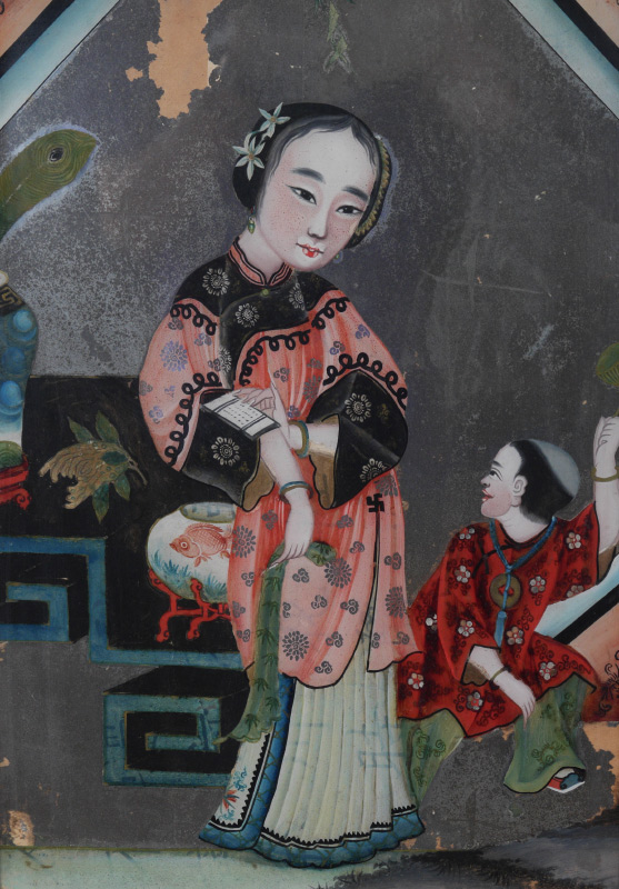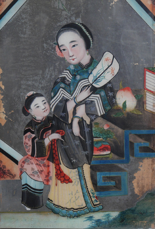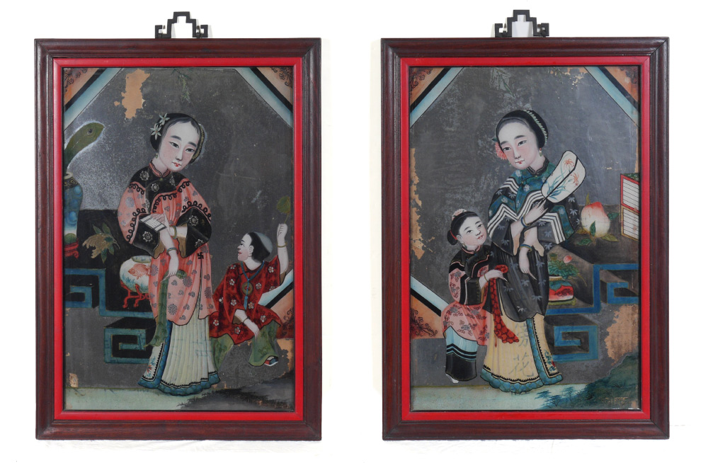 2 ORIENTAL REVERSE PAINTINGS ON GLASS: Sight size 19 1/4'' x 13'', framed, 22 « x 17'', depicts family scenes.