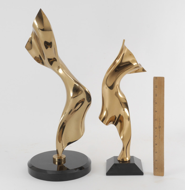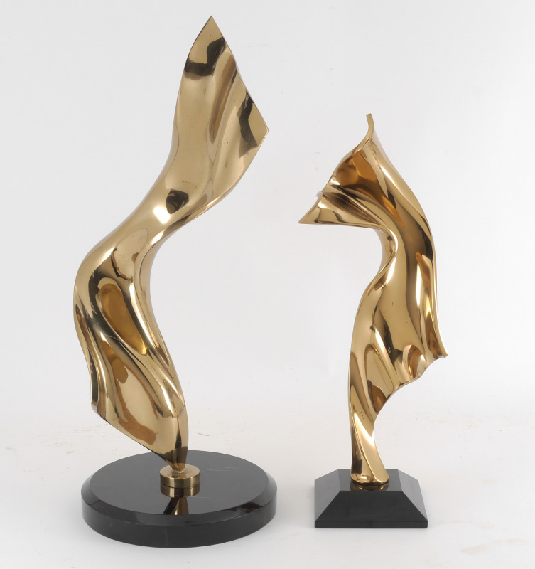 2 BRENT COLLINS ABSTRACT BRONZES: 19'' H, 15'' H, signed, numbered AP 1, affixed to polished marble plinths.