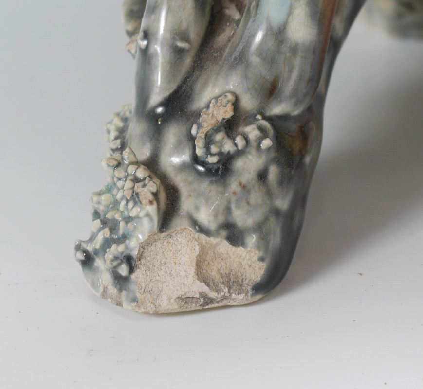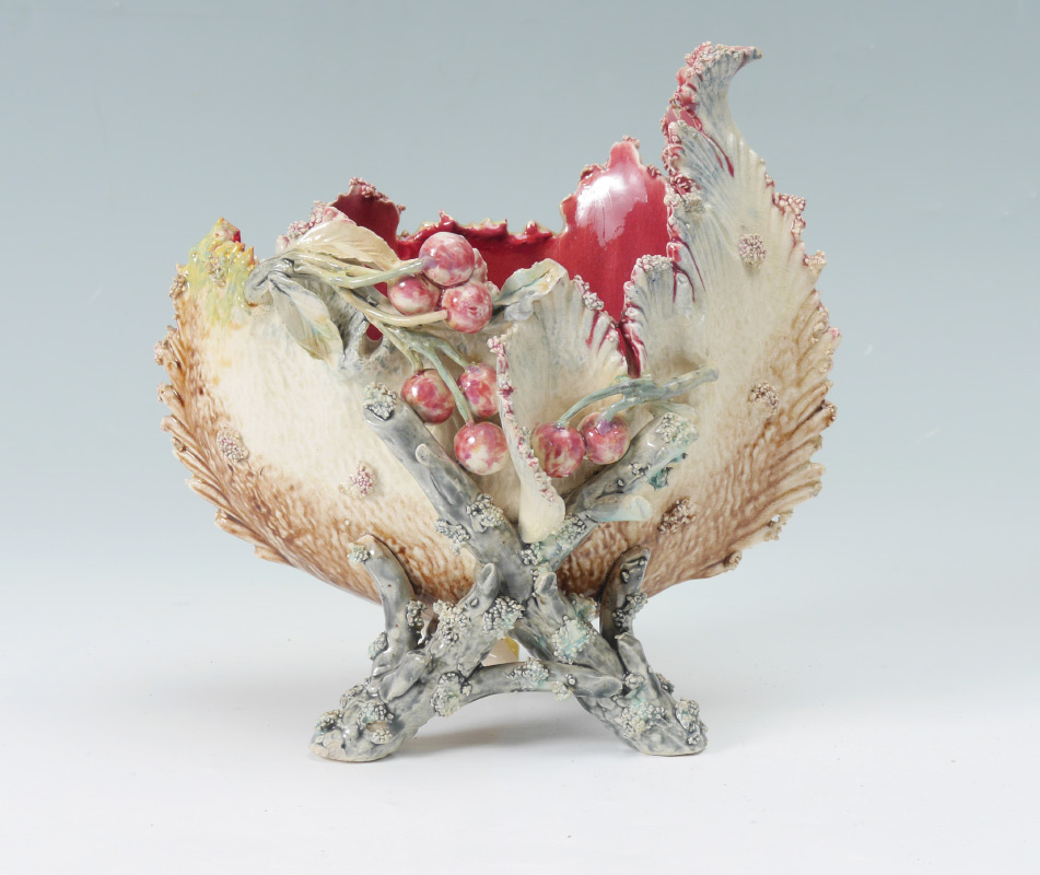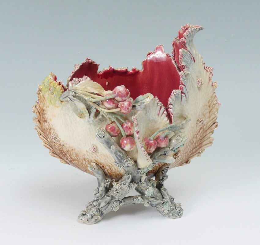 MAJOLICA CENTER BOWL: Cherries on an asymmetrical bowl supported by a branch motif base. 9 1/2'' tall x 10''.