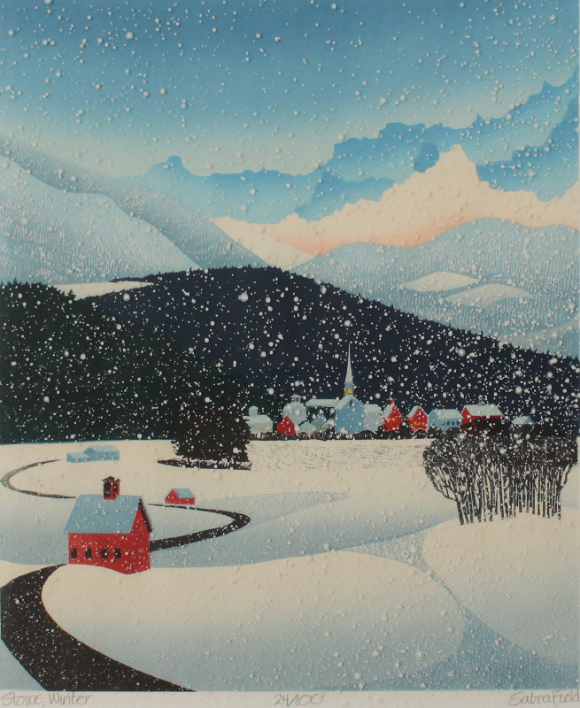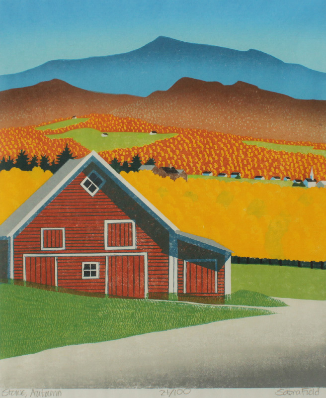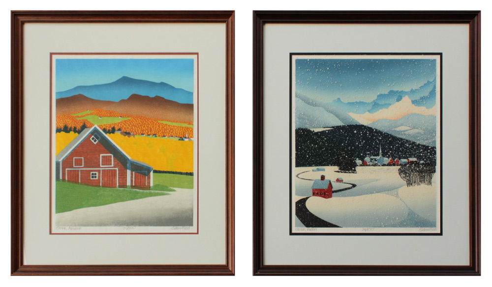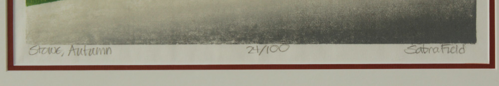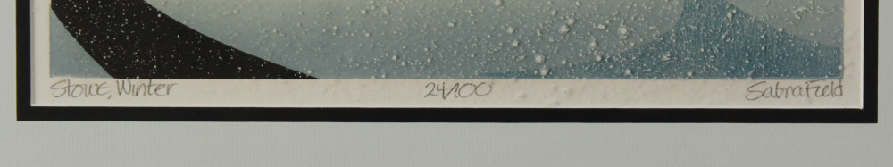 FIELD, Sabra, (American, 1935-): 2 Woodblock prints; 1) Stowe, Autumn, sight size 16 1/2'' x 14'', pencil signed lower right, titled and numbered 24/100, framed, 24 1/2'' x 22''; 2) Stowe, Winter, sight size 16 1/2'' x 14'', pencil signed lower right, titled and numbered 24/100, framed, 24 1/2'' x 22''.