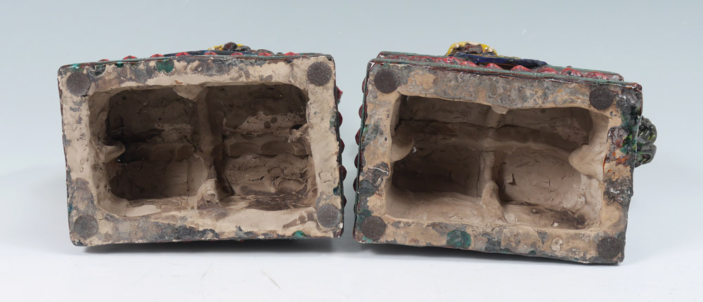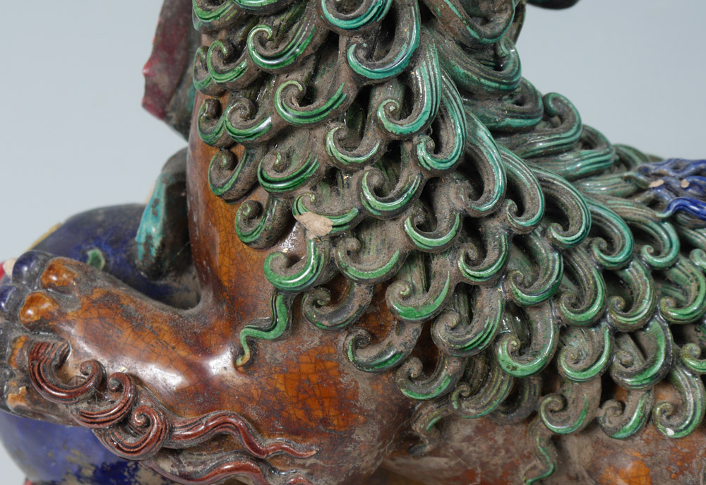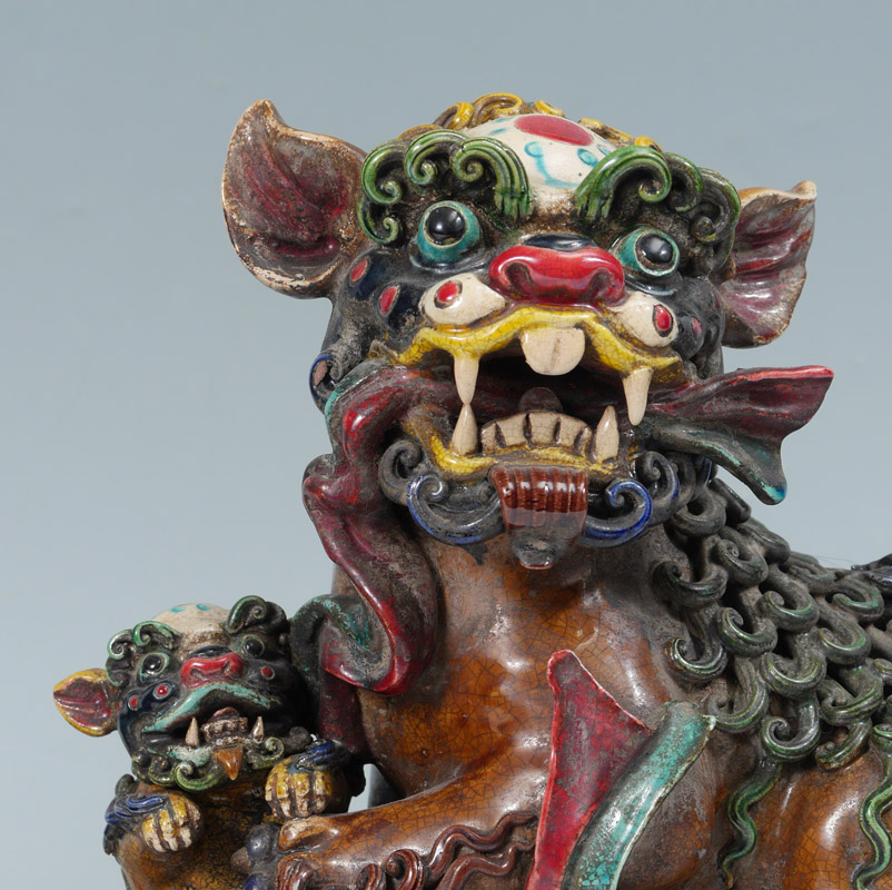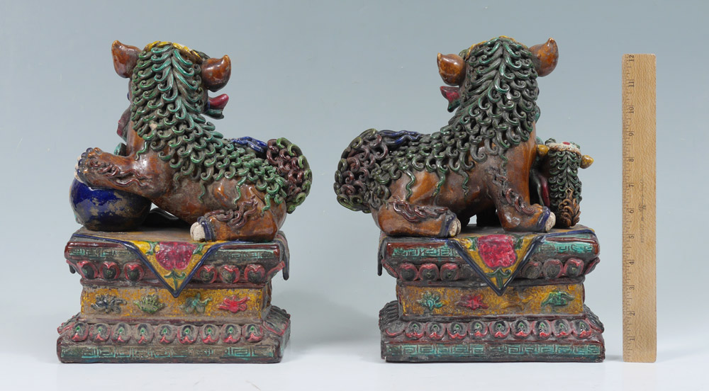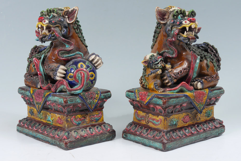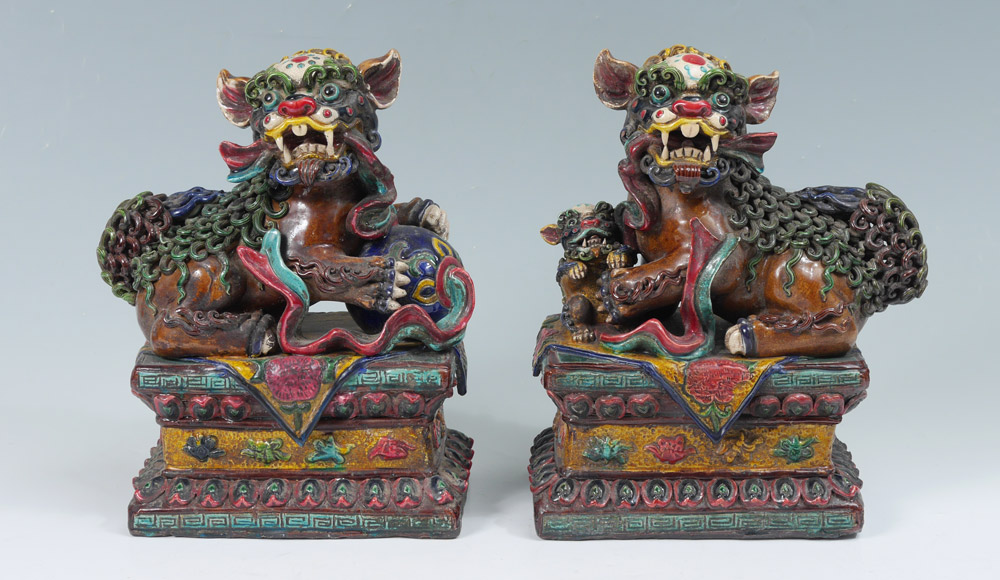PAIR POLYCHROME FOO DOGS: A most dramatic depiction of male and female. Him with his paw on a ball, representing the Earth, and her with paw on the cub. Measures approx. 12'' tall x 8'' x 6''.