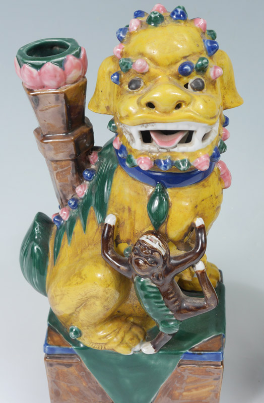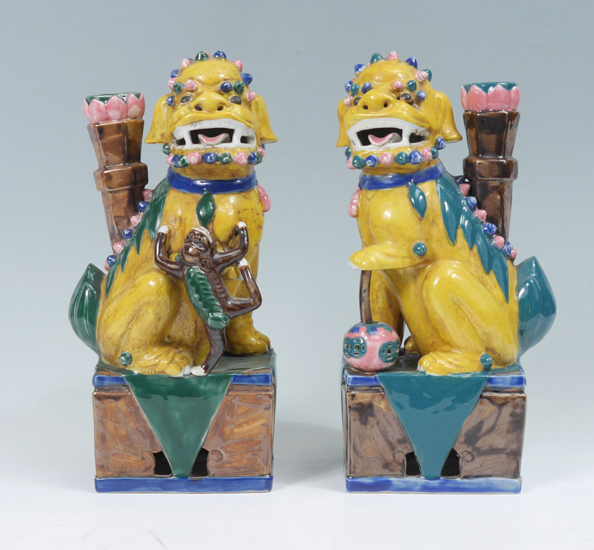 PAIR YELLOW GLAZE FOO DOGS: Male with ball and female with cub, regal yellow glaze. Measures approx. 15''h. x 6'' x 4 1/2''.