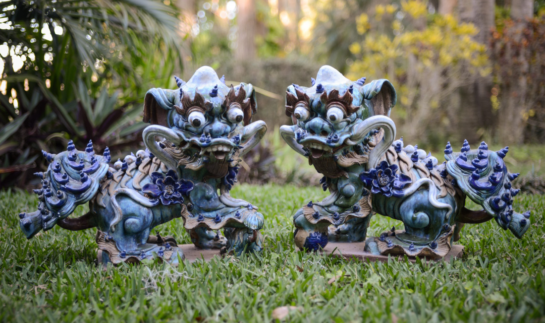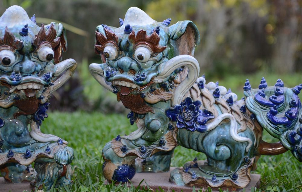 PAIR LARGE GLAZED CERAMIC FOO LIONS: Male with ball and female with cub, unique armored tail. Overall measures 16 1/2'' h. x 19'' x 12''.