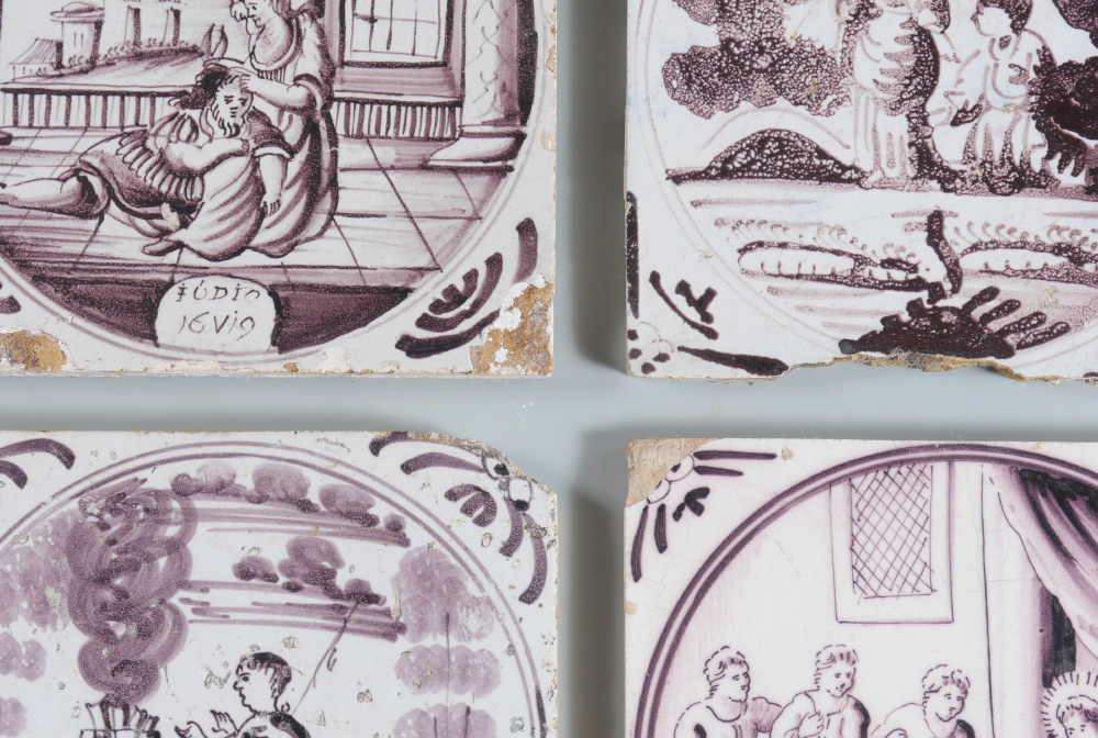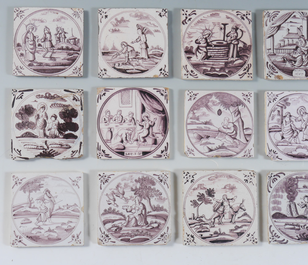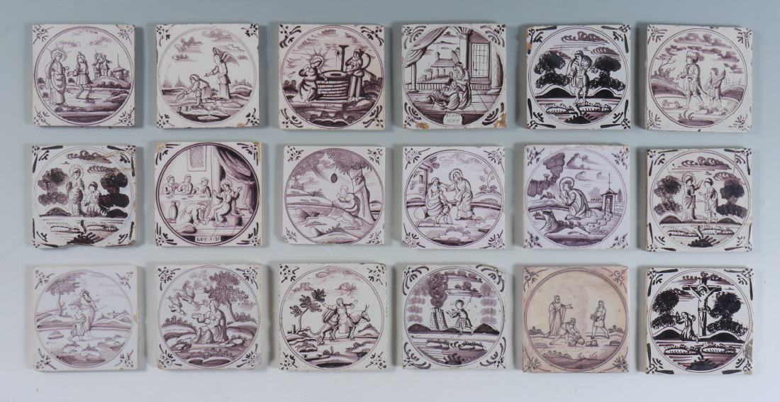 COLLECTION OF 18 DELFT TILES: Possibly 18th Century, most are religious in nature, appear to have been removed from a building. Slight variations in size, average size 5'' x 5''.