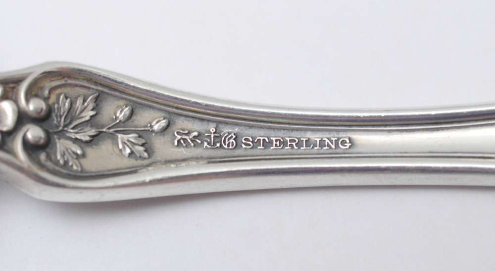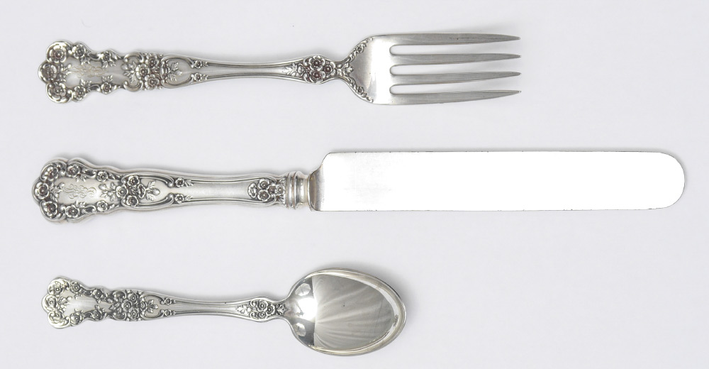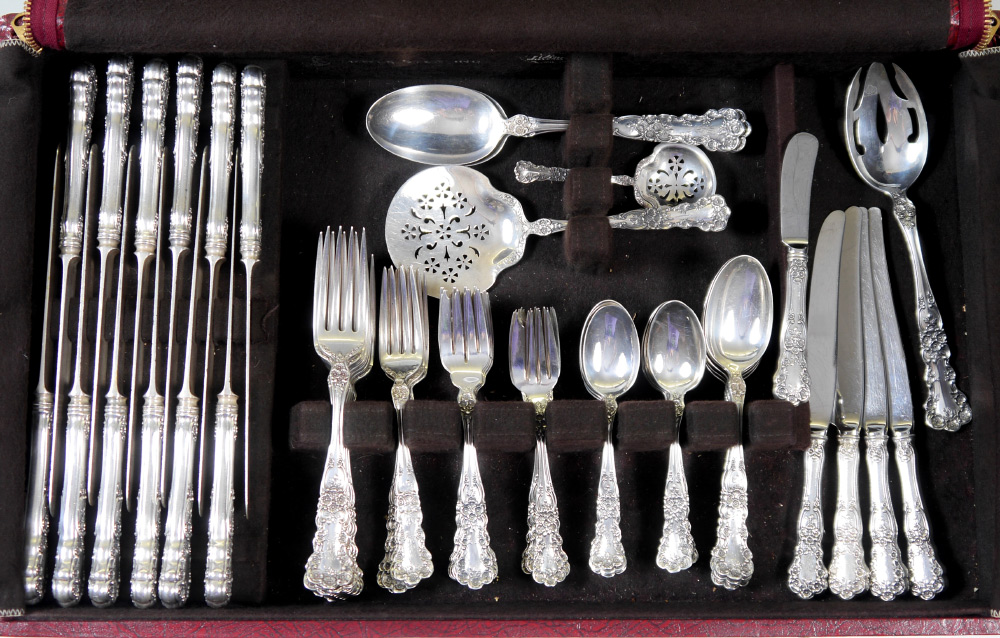 GORHAM BUTTERCUP STERLING FLATWARE SERVICE: Approx. 73 pieces in the Buttercup pattern by Gorham to include 12 forks (7 1/2''), 4 forks (7''), 9 salad forks (6 3/8''), 6 pastry forks (5 7/8''), 14 teaspoons (5 1/2''), 6 oval dessert spoons (6 7/8''), 12 blunt hollow knives (8 5/8''), 4 hollow knives (8 3/4''), hollow butter knife (6''), 2 tablespoons (8 3/8''), pierced serving spoon (8 3/8''), tomato server (7 5/8''), bon bon spoon (4 1/2''). Some, but not all, are monogrammed Approx. 82 troy oz. Sold with 4 silverplate serving pieces and faux leather silver chest, 3 1/4'' x 22 1/2'' x 13''.