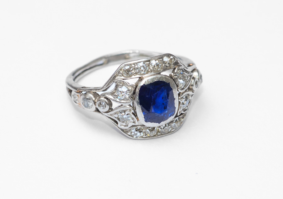 AN ESTATE PLATINUM DIAMOND AND SAPPHIRE RING Ca: 1915-1925: Platinum ring contains 18 round Swiss cut diamonds totaling approx. .33 Ct., Rated VS-SI in clarity and H-I in color. At the center is a 1.10 Ct rectangle native cut sapphire, VS-SI in clarity, B in Hue, 6 in Tone 3-4 in Saturation. Abraded crown. The diamonds are gypsy and bead set. The sapphire is gypsy set. Weight: 3.6 grams. Size: 5