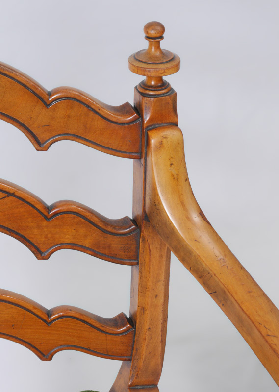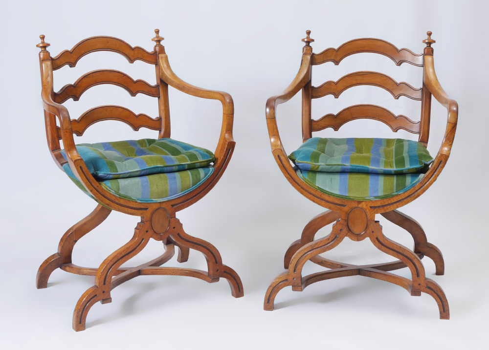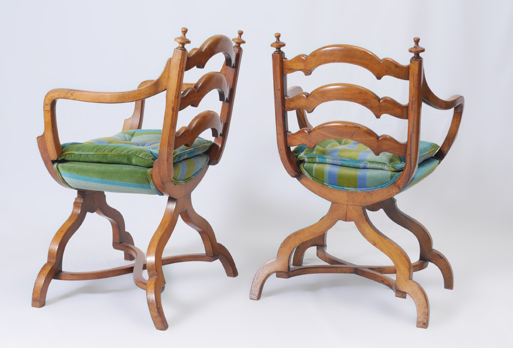 PAIR OF SAVONAROLA STYLE CHAIRS: Shaped 3 rung ladder back and arms. Carved curved ''X'' shaped base seat and legs, striped upholstery. Overall measures 35'' h. x 23'' x 19''.
