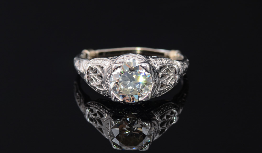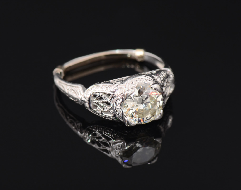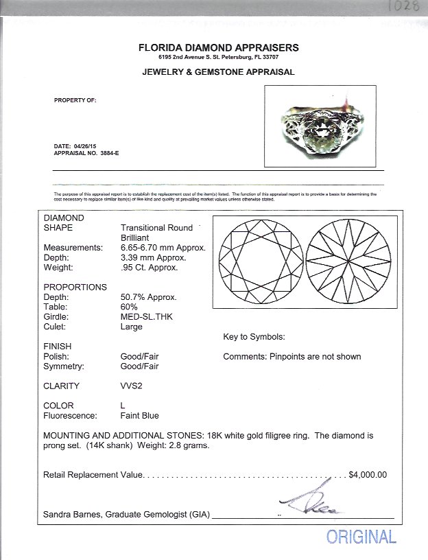 ESTATE .95 CT DIAMOND SOLITAIRE RING: 18K white gold filigree ring centering an approx. .95 Ct transitional round brilliant diamond, .95 Ct., rated VVS2 clarity and L color. Size 6. Weight 22.8 gram. The shank is 14K. Sold with current Florida Diamond Appraisers GIA graduates appraisal for $4000.