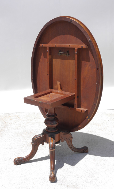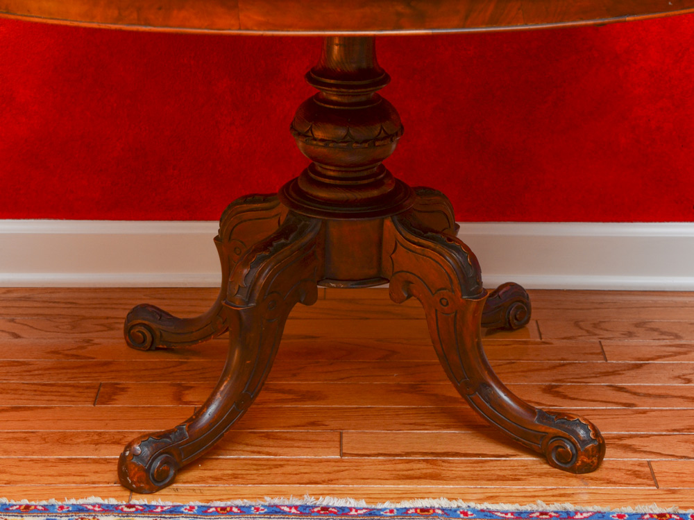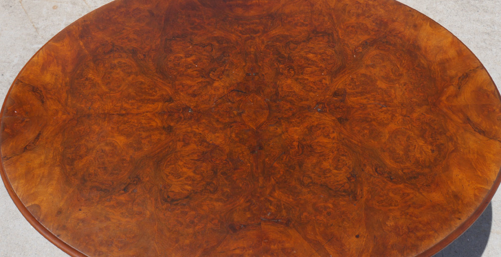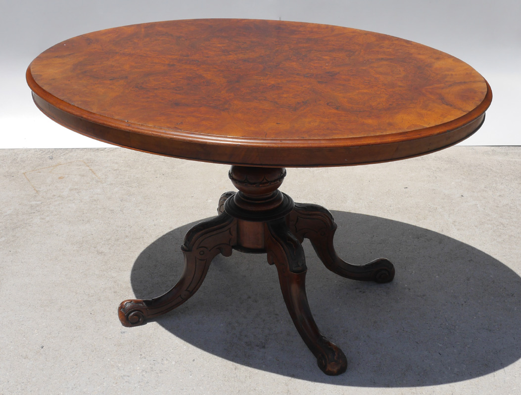 BURL WOOD OVAL FOYER TABLE: Oval burl veneer top, carved and turned pedestal support over 4 carved splayed legs. Overall measures 27 1/4'' h. x 46 1/2'' x 34 3/4''.