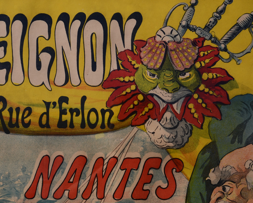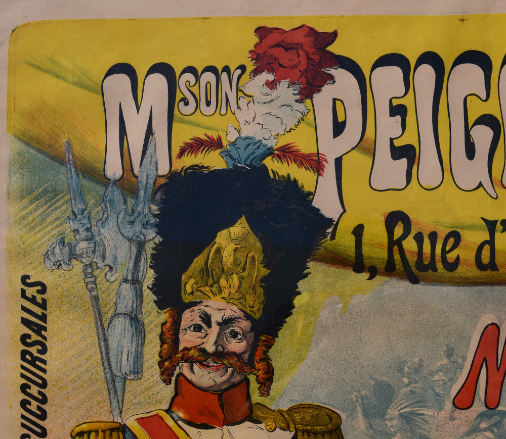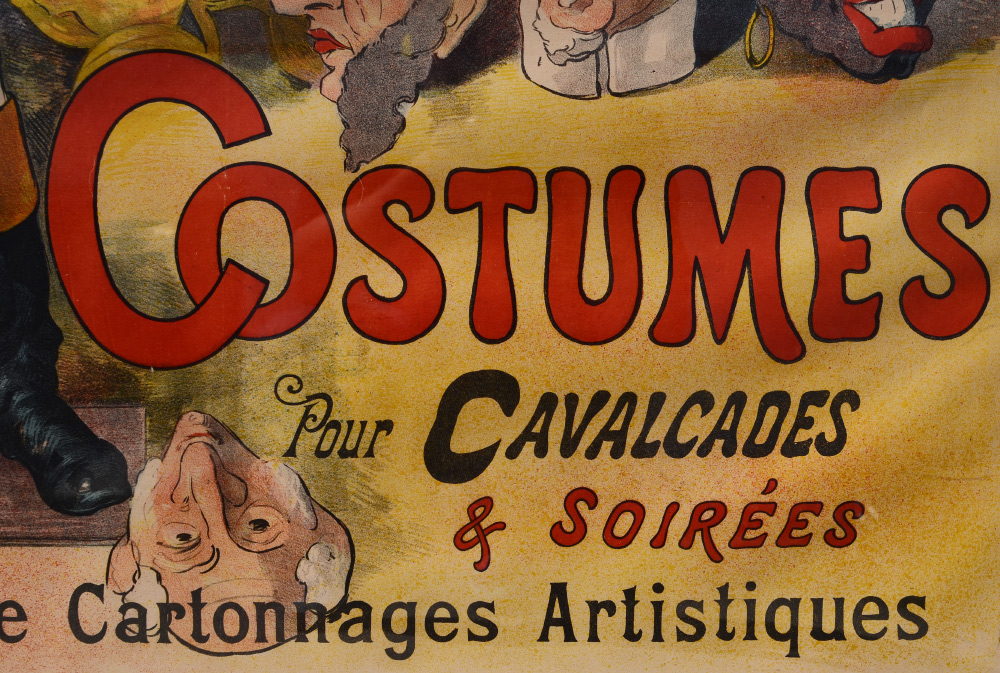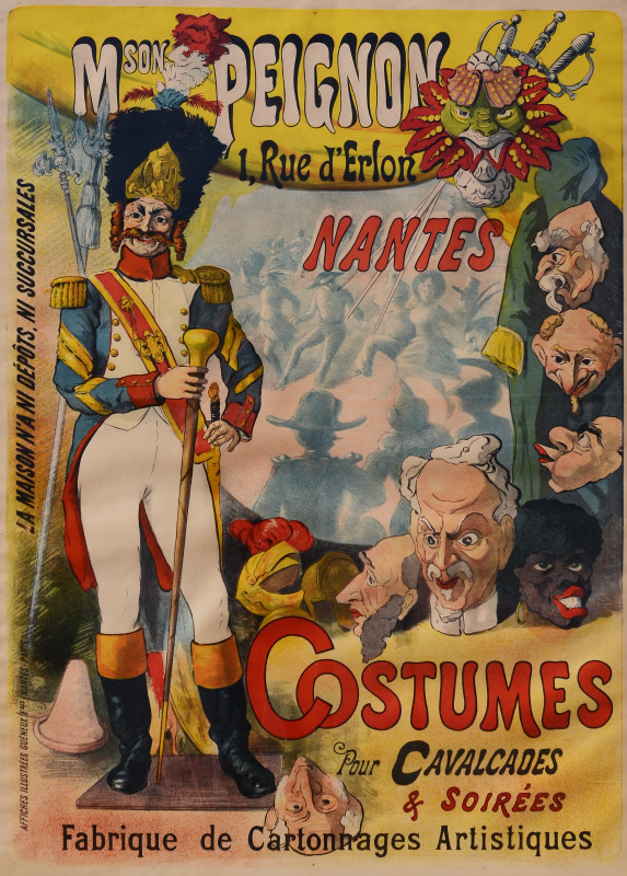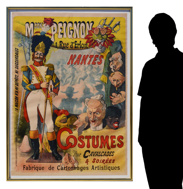 VINTAGE FRENCH POSTER MAISON PEIGNON: Costumes Pour Calvalcades et Soirees, 48 1/2'' x 34 1/4'', contemporary metal frame, 52'' x 38''. CONDITION: Laid down on white paper backing, vertical crease with white backing showing through several pinpoints.