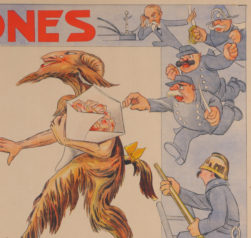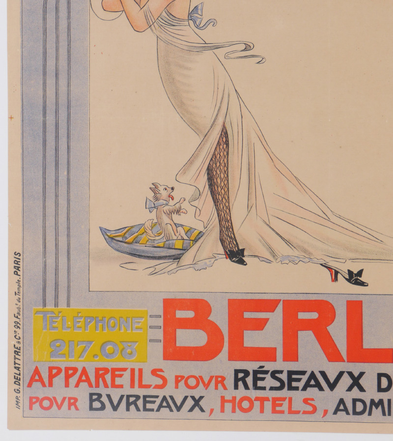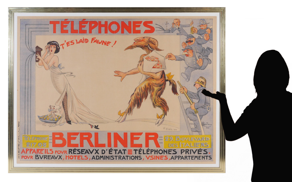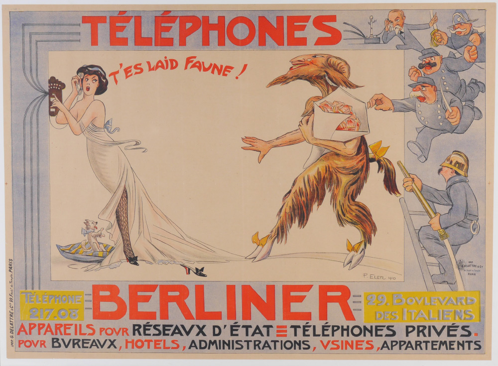 LARGE VINTAGE FRENCH POSTER BERLINER 1910 P. ELER: ''Telephones'', T'es Laid Faune, 39'' x 53 1/2'', framed, 44'' x 58 1/2''.