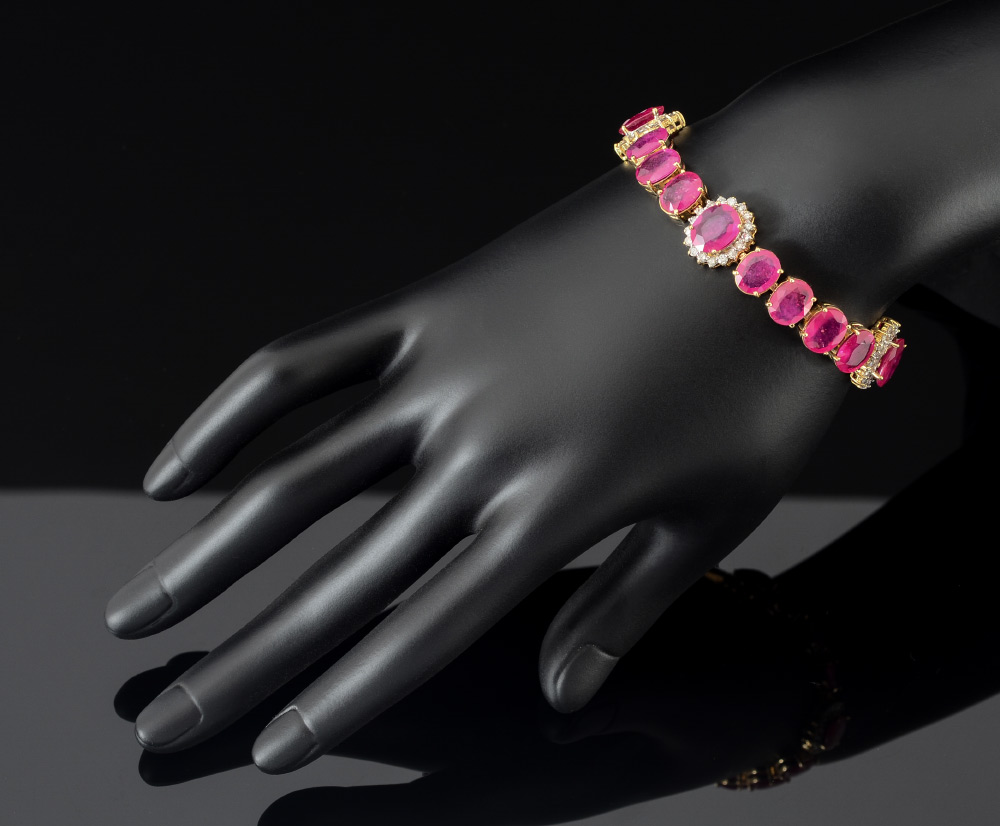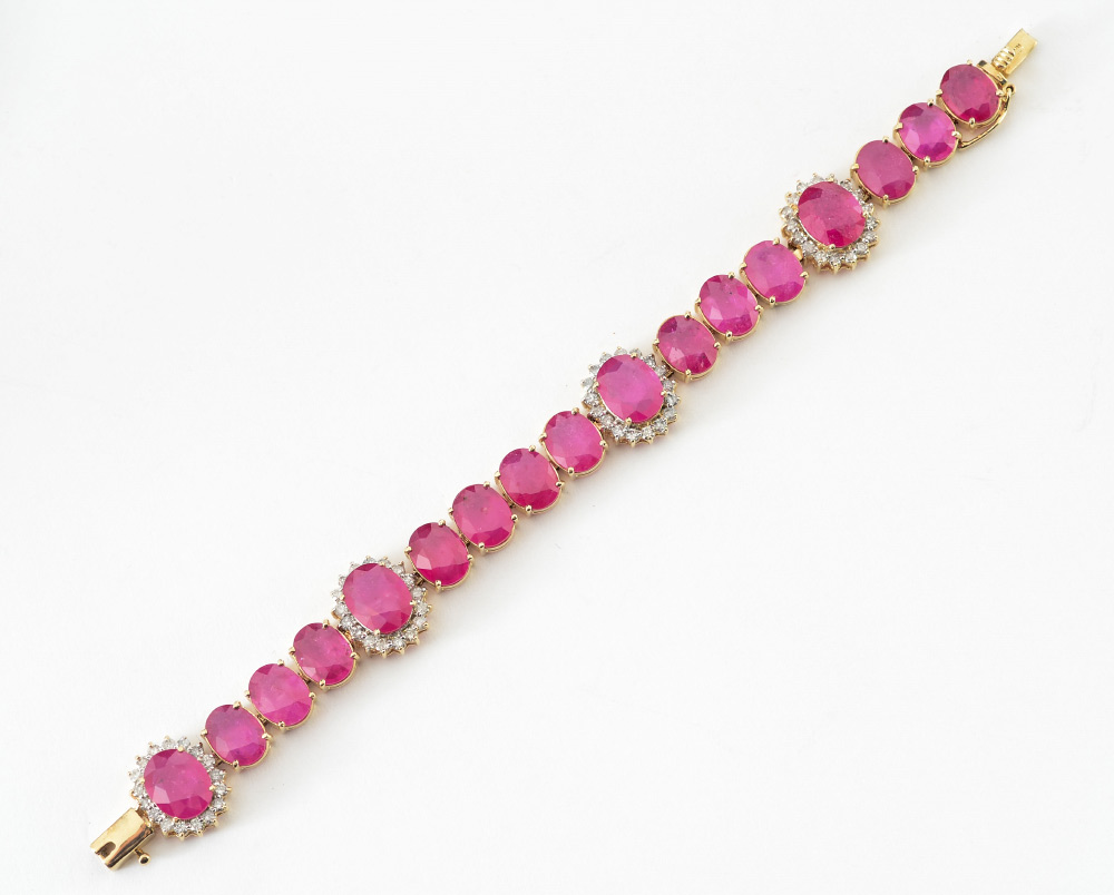 43.85 CTW RUBY & DIAMOND BRACELET: 14K yellow gold bracelet contains 17 oval mixed cut rubies totaling approx. 42.50 Ct. The rubies are clarity and color enhanced. The 68 round full cut diamonds total approx. 1.35 Ct., are rated I1-I2 in clarity and I-J-K in color. The rubies and diamonds are prong set. Locking closure with figure eight safety clasp. Length 6.5''. Gold weight: 13.3 grams approx.