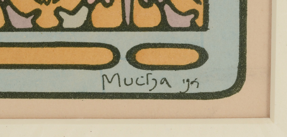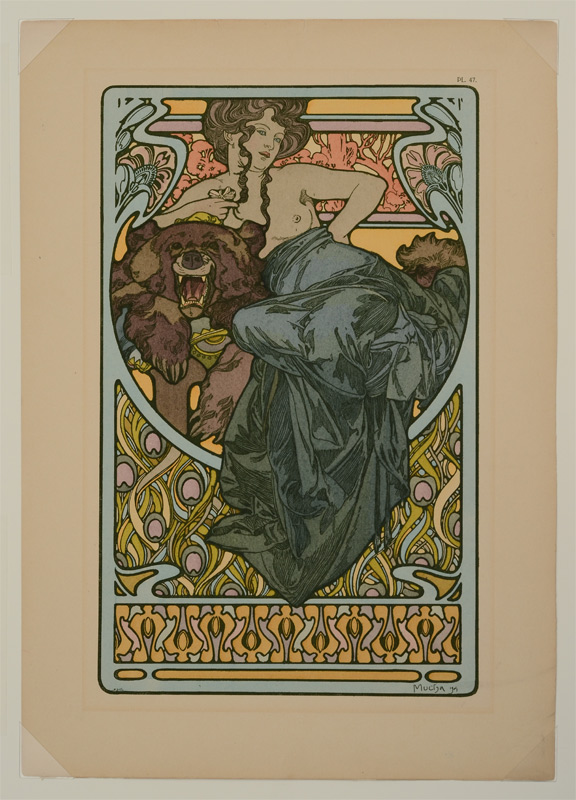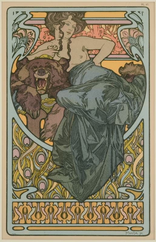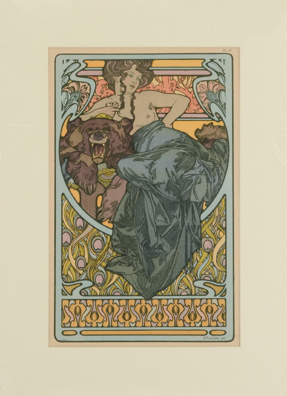MUCHA, Alphonse, (Czech Republic, 1860-1939): Woman and Bear, from Documents, Pl. 47, 1902, size with margins 18'' x 12 7/8'', matted, 20 1/4'' x 14 3/4''.