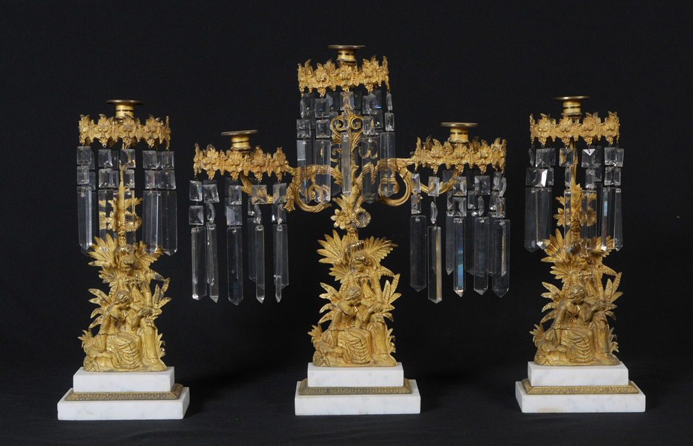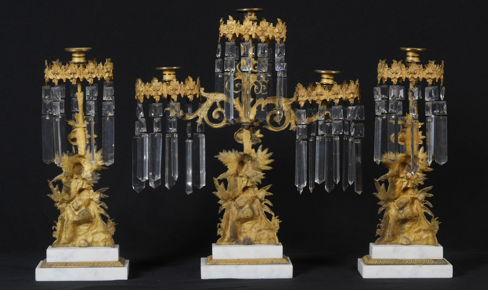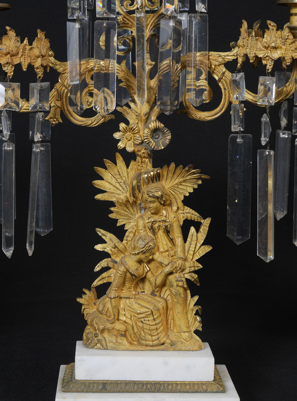 FIGURAL BRASS AND CRYSTAL 3 PC GIRANDOLE SET: Gentleman and seated lady in a detailed foliate setting, brass on multi level marble bases, each sparkling with prisms. Center triple light measures approx. 19''h. x 16''w., base 6 1/2'' x 4''. Single lights measure approx. 16''h. with 6 1/2'' x 3 1/2'' bases.