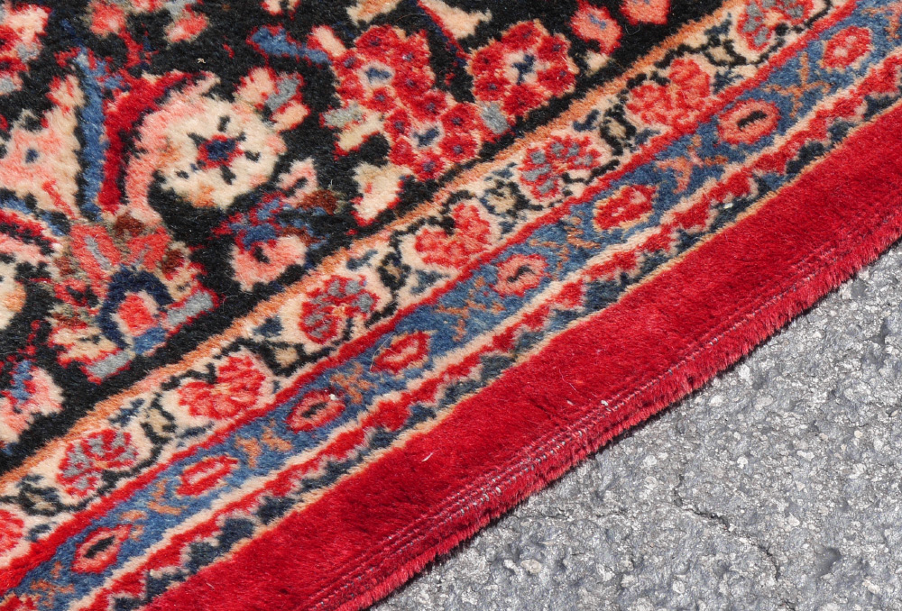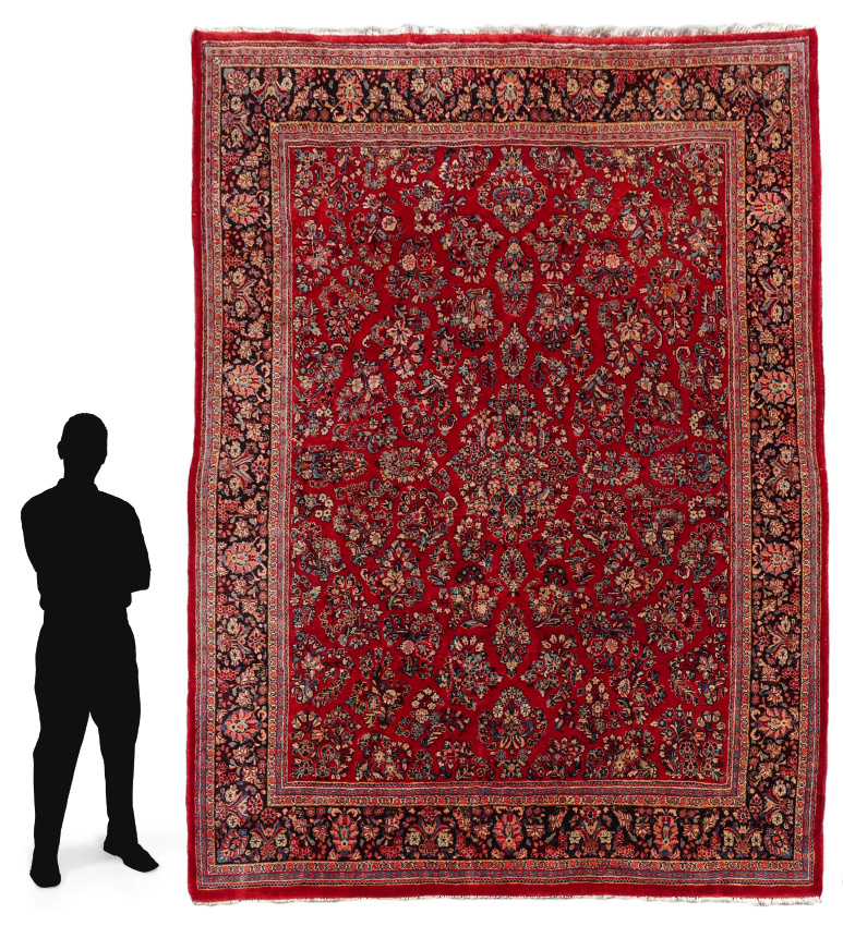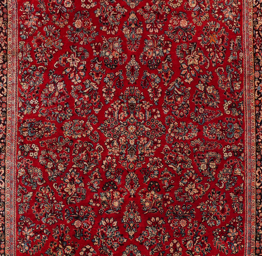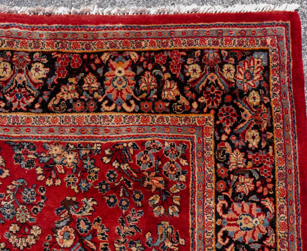 APPROX. 60-80 YR. OLD PERSIAN SAROUK HAND KNOTTED WOOL RUG, 9' x 12': This ''Royal'' Sarouk has traditional patterns and colors. The tomato red of the field is covered with small sprays of various flowers done in colors that include blue, pink, white, black, and green. The main border has a black ground that contrasts nicely with the field. This is a meaty rug made with good wool.