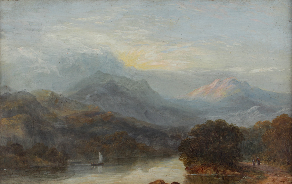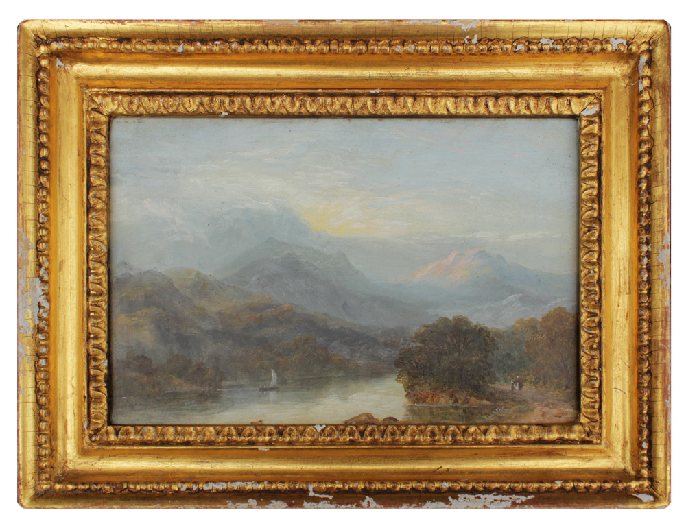 19TH CENTURY MINIATURE PEACEFUL RIVER: Oil/Board, sight size 5 1/2'' x 8 3/4'', no visible signature, gilded gesso frame, 8 1/2'' x 12''.