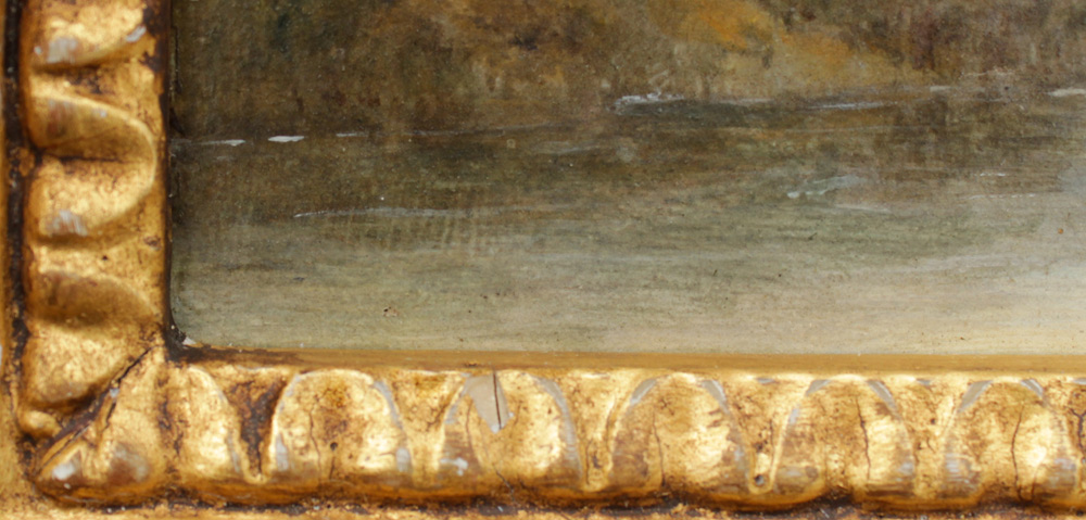 CONDITION: Needs cleaning, crack in upper left corner, frame has wear and loss of gilt.