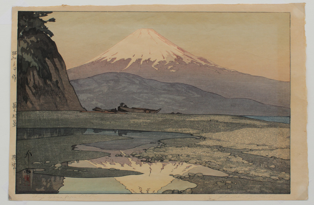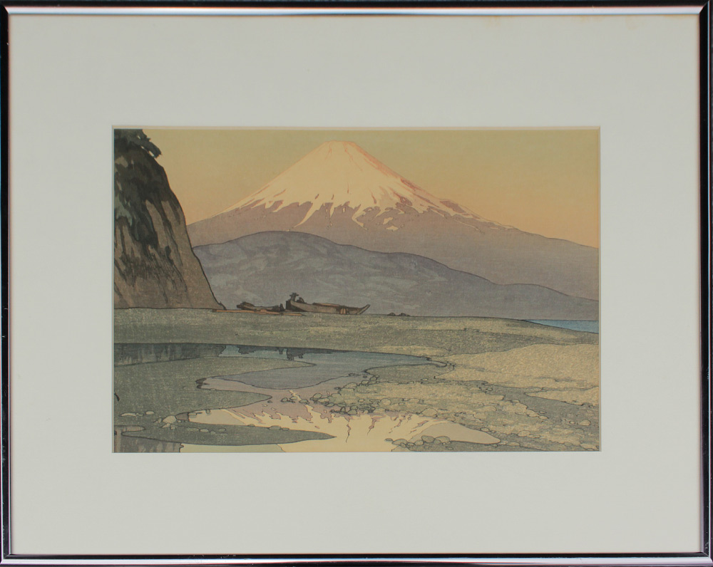 YOSHIDA, Hiroshi, (Japanese, 1876-1950): ''Mt. Fuji from Okitsu'', Japanese Woodblock Print, 10 1/2'' x 16'', framed, 16'' x 20''.