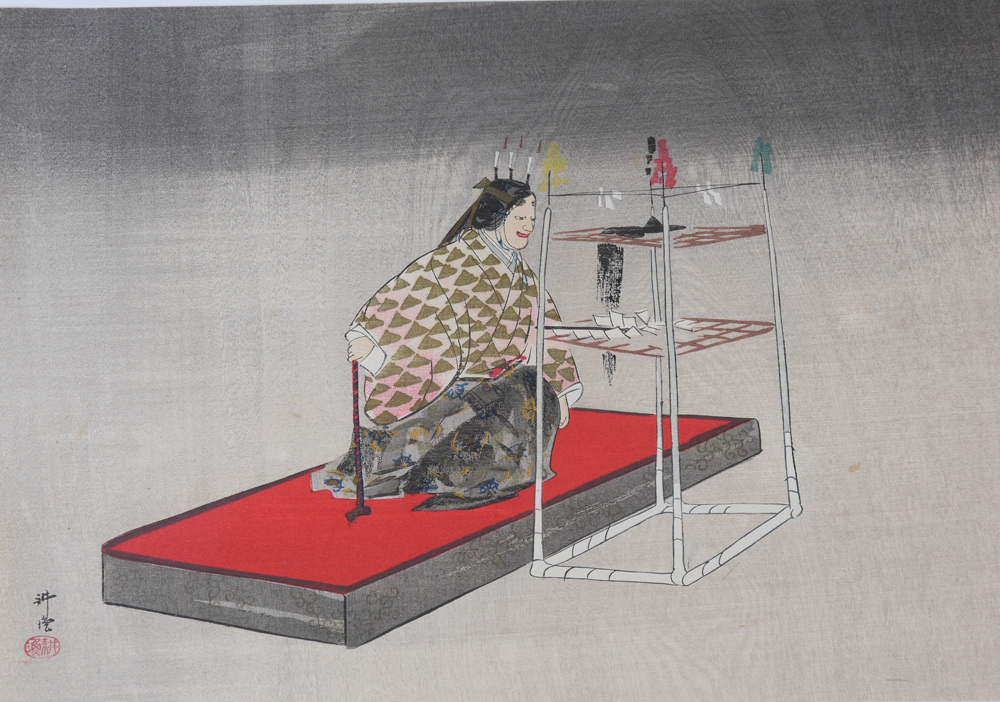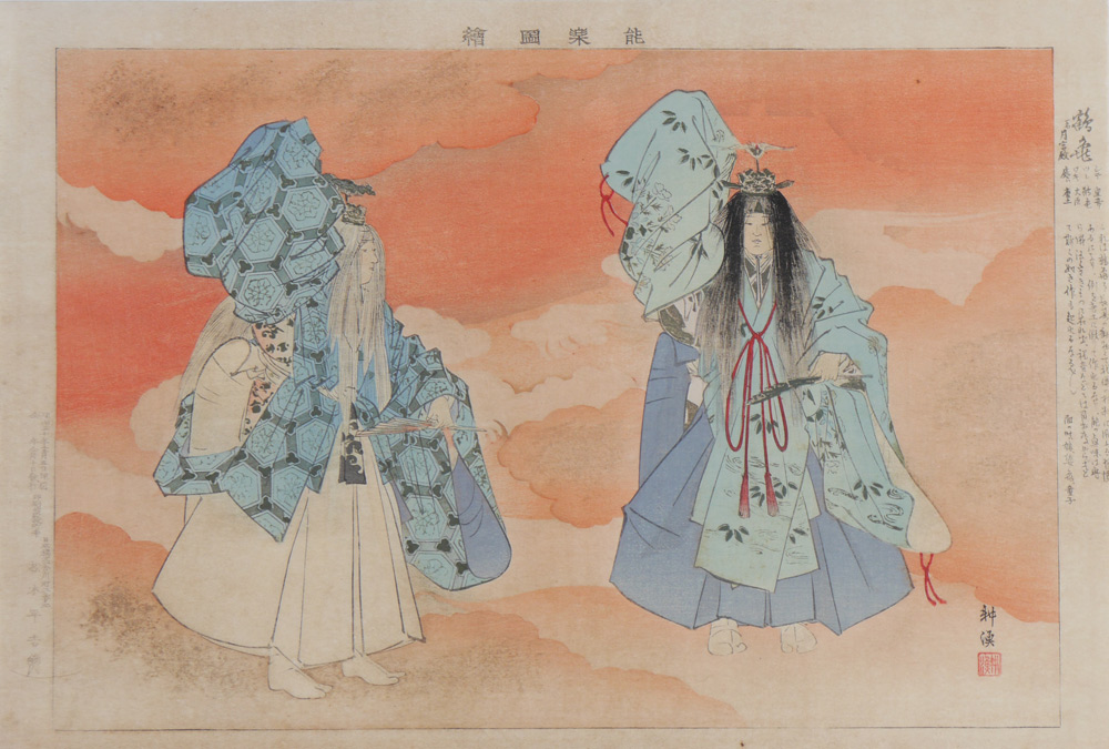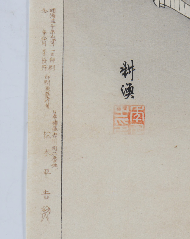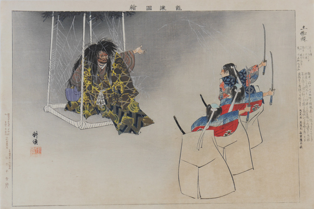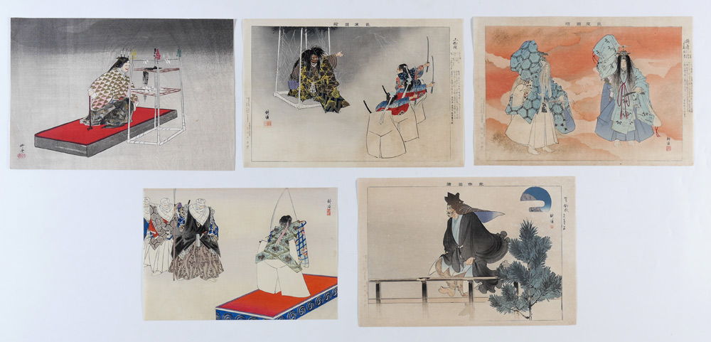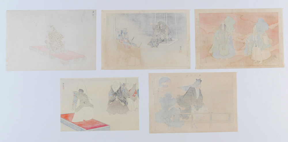 KOGYO, Tsukioka, (Japanese, 1869-1927): 5 pc Woodblock Print Lot; 1) Curse, 14.7'' x 10'', 2) Tadanobu, 12.8'' x 8.9'', 3) Kyogen, 14.6'' x 10'', 4) Crane and Turtle, 14.8'' x 10'', 5) Earth Spider, 14.6'' x 9.9'', all unframed. COA Artelino