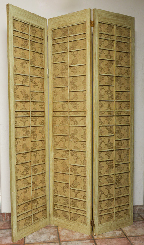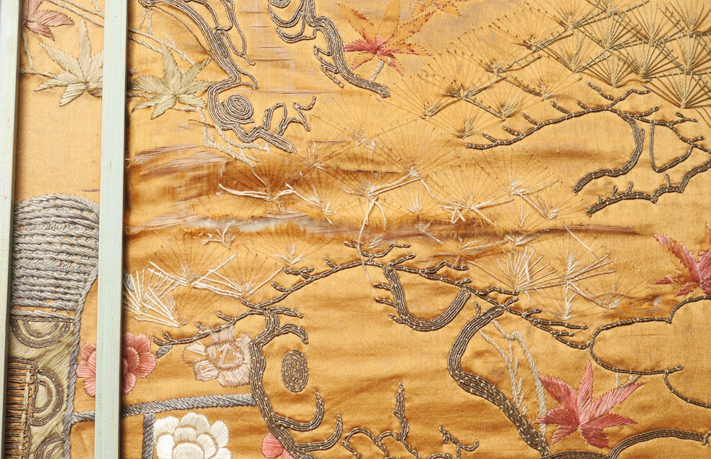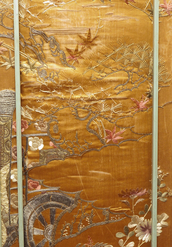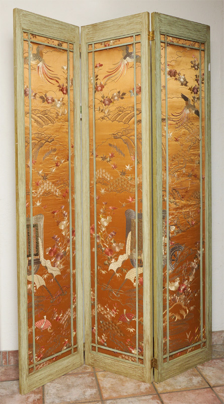 CHINESE EMBROIDERED SILK FLOOR SCREEN: 3 panels with silk embroidered outdoor genre scenes and birds. Each panel 80'' x 18'', 3 3/4'' wide overall.