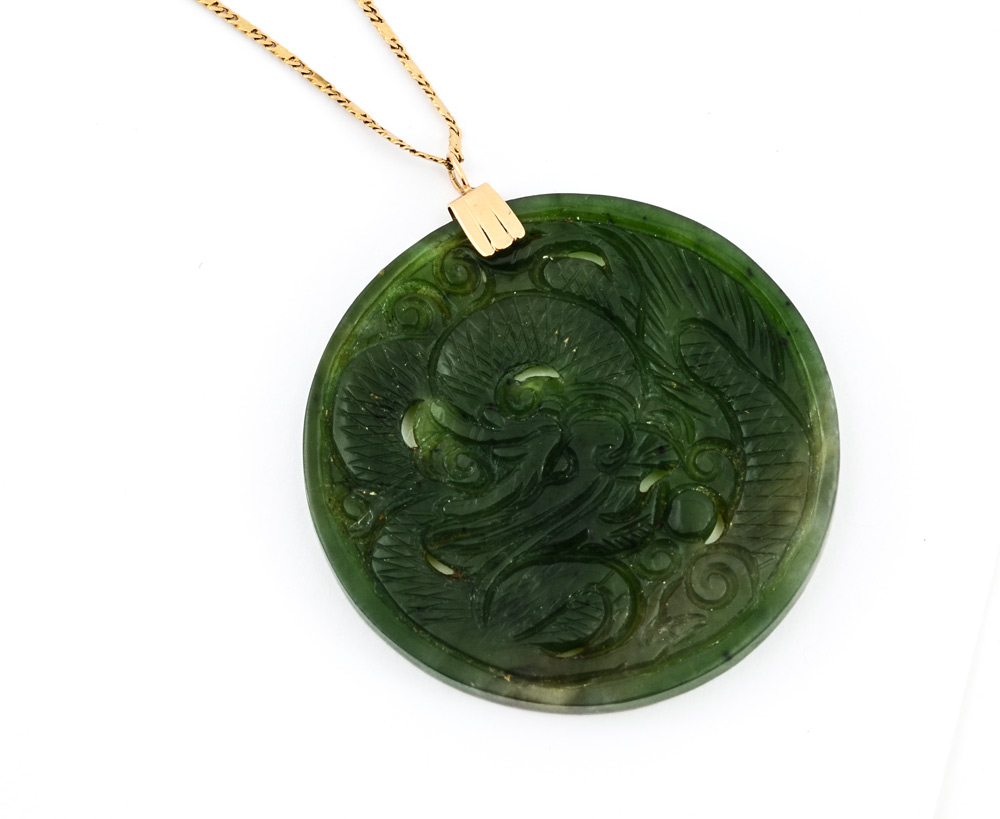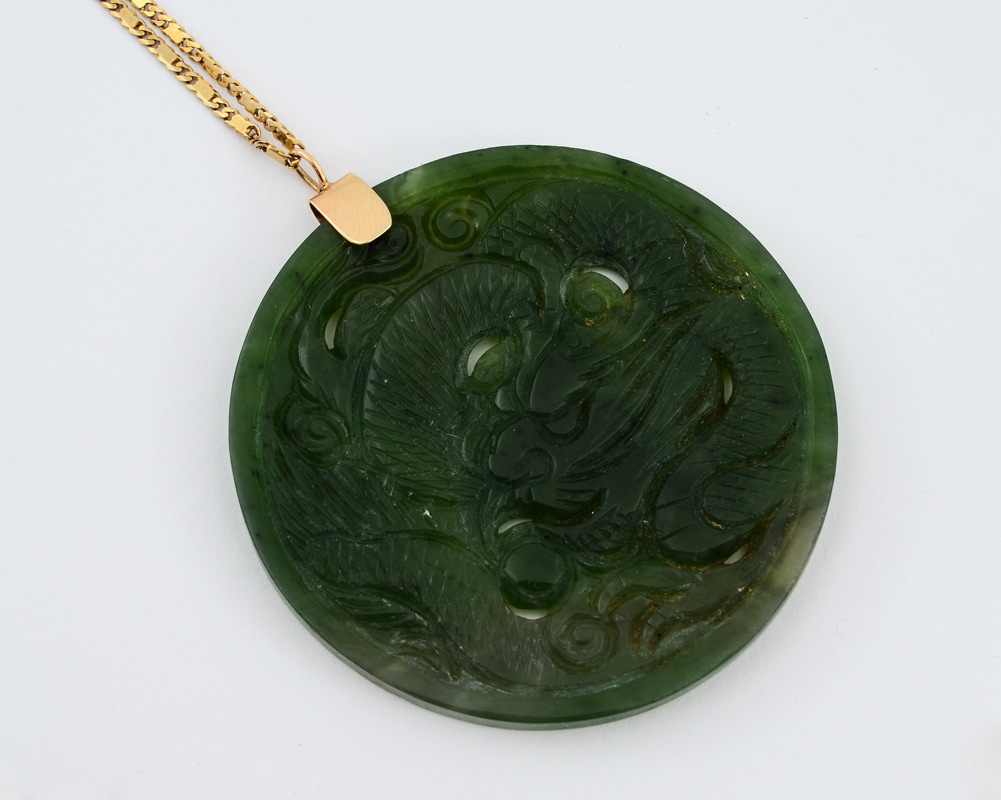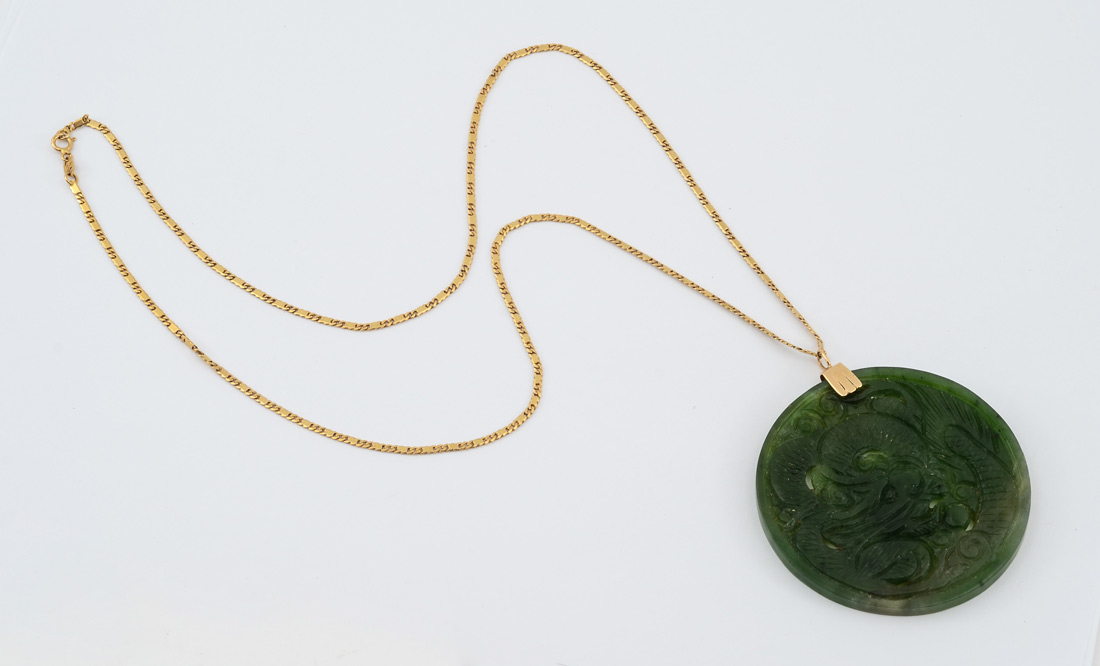 ORIENTAL CARVED GREEN STONE PENDANT: Pierce carved green to grey stone disk, possibly jade or serpentine, depicts a dragon with ball, 2 3/8'' diam., 14k gold bail, 14k Italian chain, 24''.