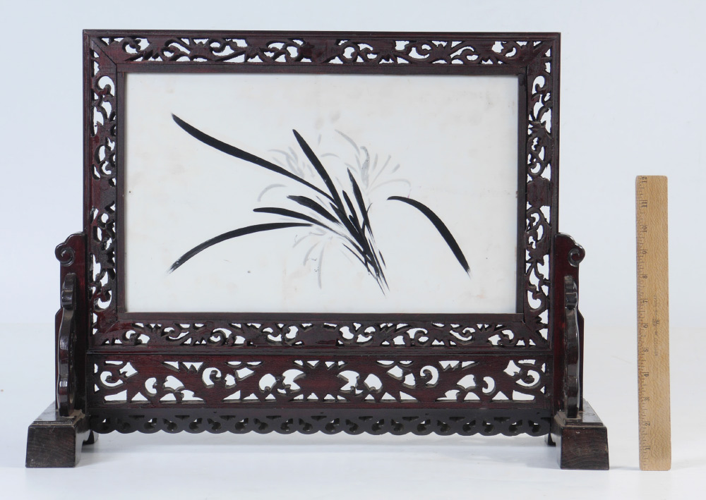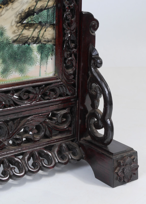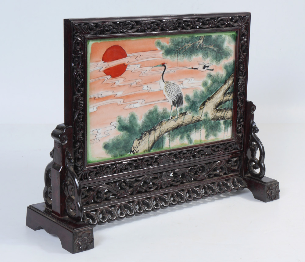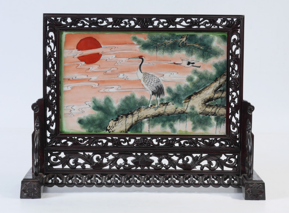 ORIENTAL PAINTED PORCELAIN TABLE SCREEN: Carved and pierced foliate motif frame and stand, porcelain plaque insert with polychrome painted scene of cranes and tree at sunset one side, monotone stylized reeds on the other. Overall measures 18'' h. x 23 3/4'' x 8''.