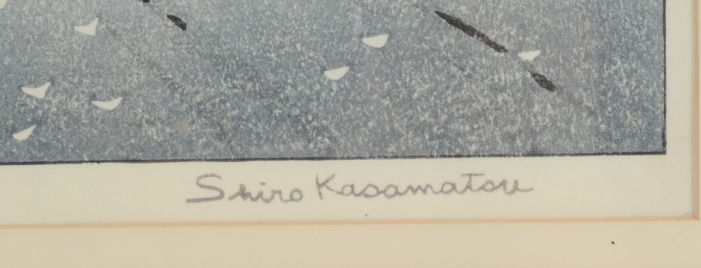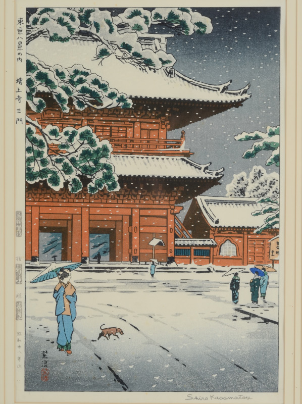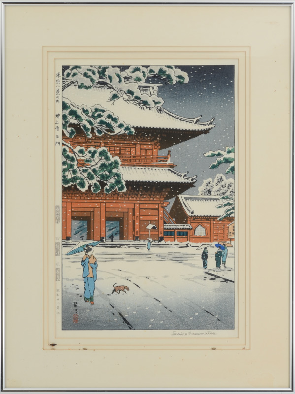 KASAMATSU, Shiro, (Japanese, 1898-1991): Winter Temple Scene, Japanese Woodblock Print, sight size 14 3/4'' x 9 3/4'', signed lower right, metal frame, 21 1/4'' x 16 1/4''.