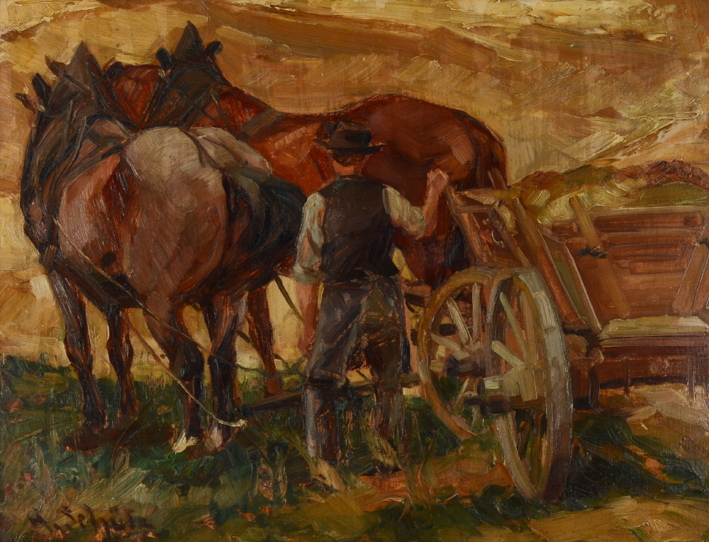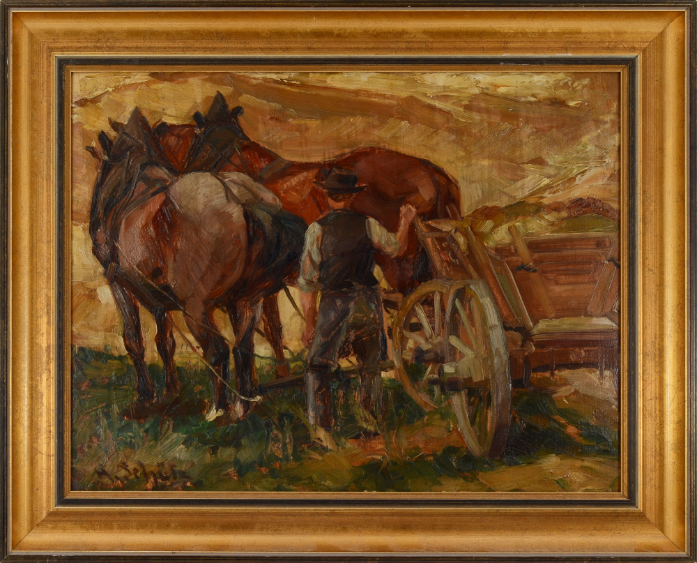 SCHUTZ, Heinrich, (German, 1875-1956): Team of Horses Pulling a Cart with Man Directing, Oil/Board, 16 3/4'' x 21 1/2'', signed lower left, framed, 21 1/4'' x 26''.
