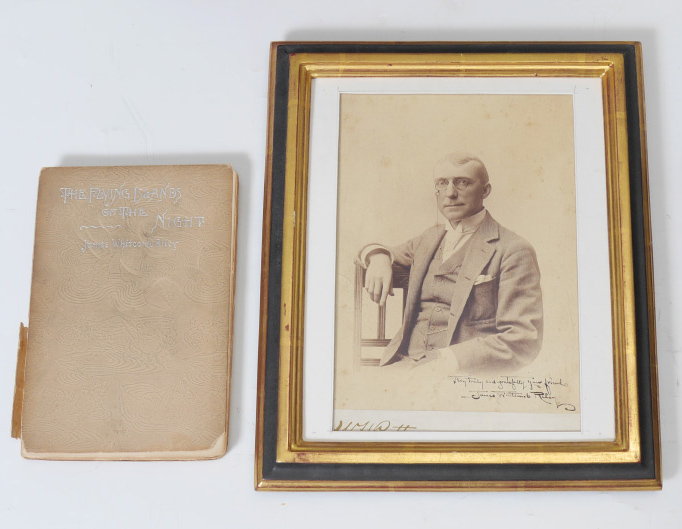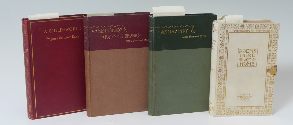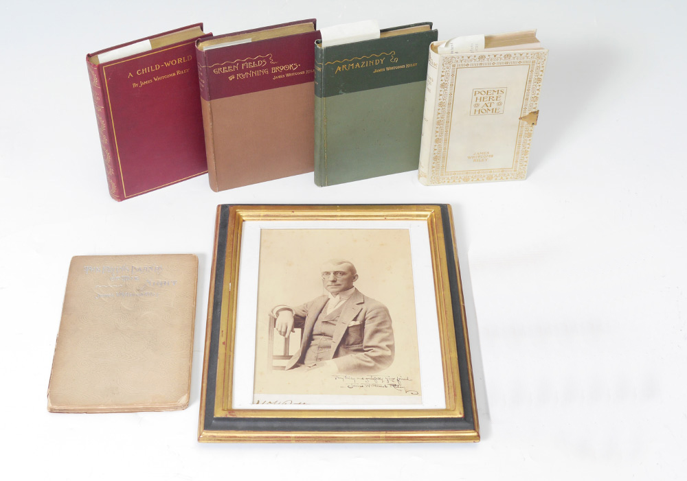 RILEY, James Whitcomb, (American 1849-1916): Collection of 5 signed books to include 1) ''The Flying Islands of the Night'', 1892, Bowen-Merrill Company, First Edition, first printing, 88 pages, embossed cherub covers. Signed and dated 1892 with hand written poem. 2) ''Green Fields and Running Brooks'', 1892, Bowen-Merrill Company, First Edition, 224 pages, maroon over brown cloth covers. Signed and dated with dedication 1893. 3) ''Poems Here at Home'', Century Co., 1893, First American Edition, 187 pages, vellum cover with gilt decoration. Signed and dated 1893 on inside photograph. 4) ''Armazindy'', 1894, Bowen-Merrill Company, First Edition, 169 pages, dark green over light green cloth covers. Signed and dated 1894 with dedication. 5) ''A Child-World'', 1897 (1896), Bowen-Merrill company, 209 pages, gilt red cloth covers. Signed and dated 1896 with dedication. 6) Cabinet photo signed with unnamed dedication, sight size 8 3/4'' x 6'', framed 12'' x 10''.