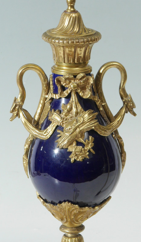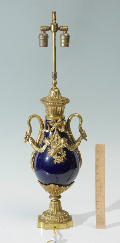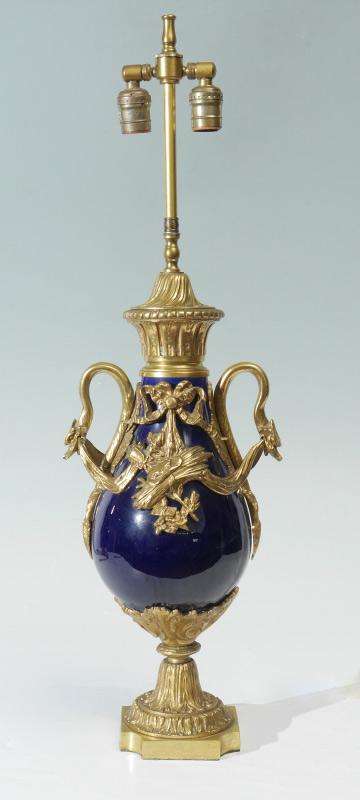 FRENCH DORE BRONZE MOUNTED LAMP: Cobalt glazed porcelain mounted with figural serpent handles, ribbon, swags and other motifs. Floriform cast bronze base, double socket fixture. No shade. Overall measures 30'' h. x 9'' x 6 1/2''.
