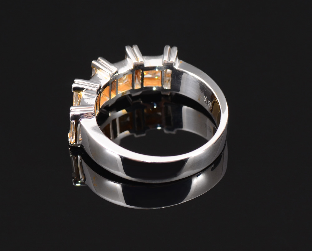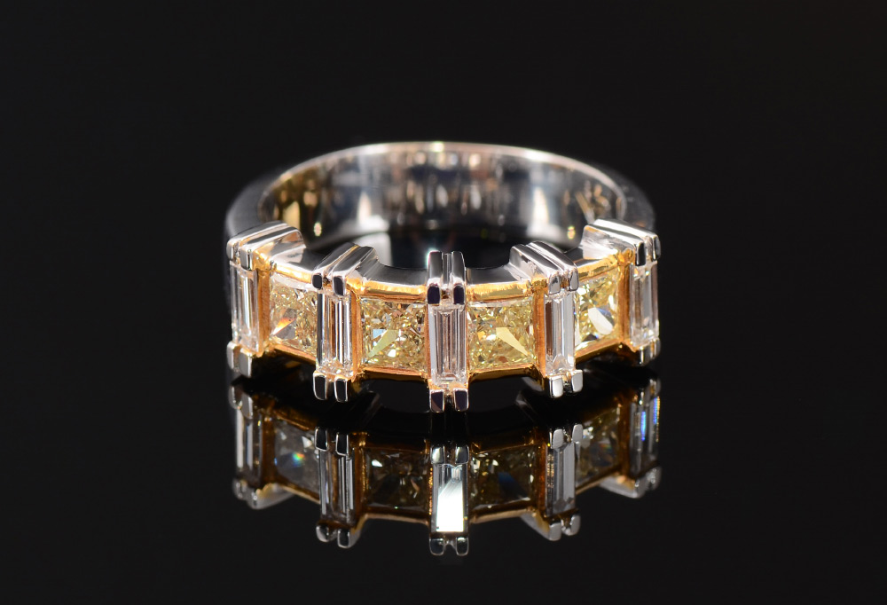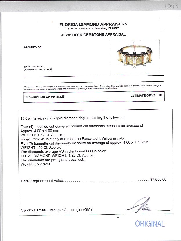 NATURAL FANCY YELLOW DIAMOND RING 1.82 CTW: 18K white and yellow gold ring featuring 4 natural Fancy Yellow diamonds, square cut corner brilliant, 4x4 mm, totaling approx. 1.32 Ct. The yellow diamonds alternate with 5 baguette cut diamonds totaling approx. .50 Ct., rated VS in clarity and G-H color. Size 8.5. Weight 8.9 grams. Sold with current Florida Diamond Appraisers GIA graduates appraisal for $7,500.