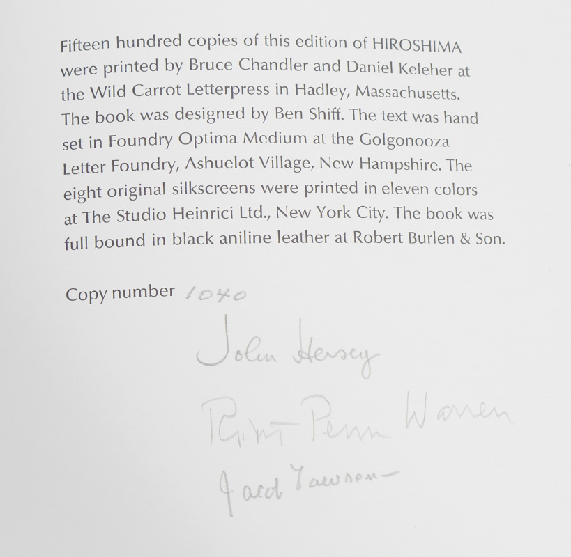 LAWRENCE, Jacob, (American, 1917-2000): 8 silkscreens in the book ''Hiroshima'' by John Hersey with original poem by Robert Penn Warren, published 1983 by The Limited Editions Club, signed by Lawrence, Hersey and Warren on back page, numbered 1040. Sold with original slipcase, 13 1/2'' x 10 1/4'' x 1 3/8''.