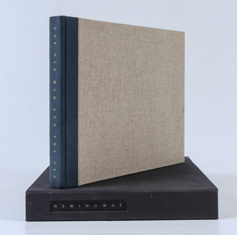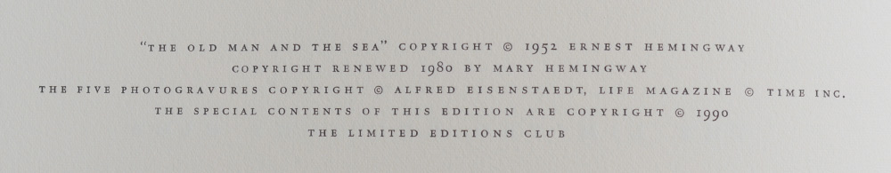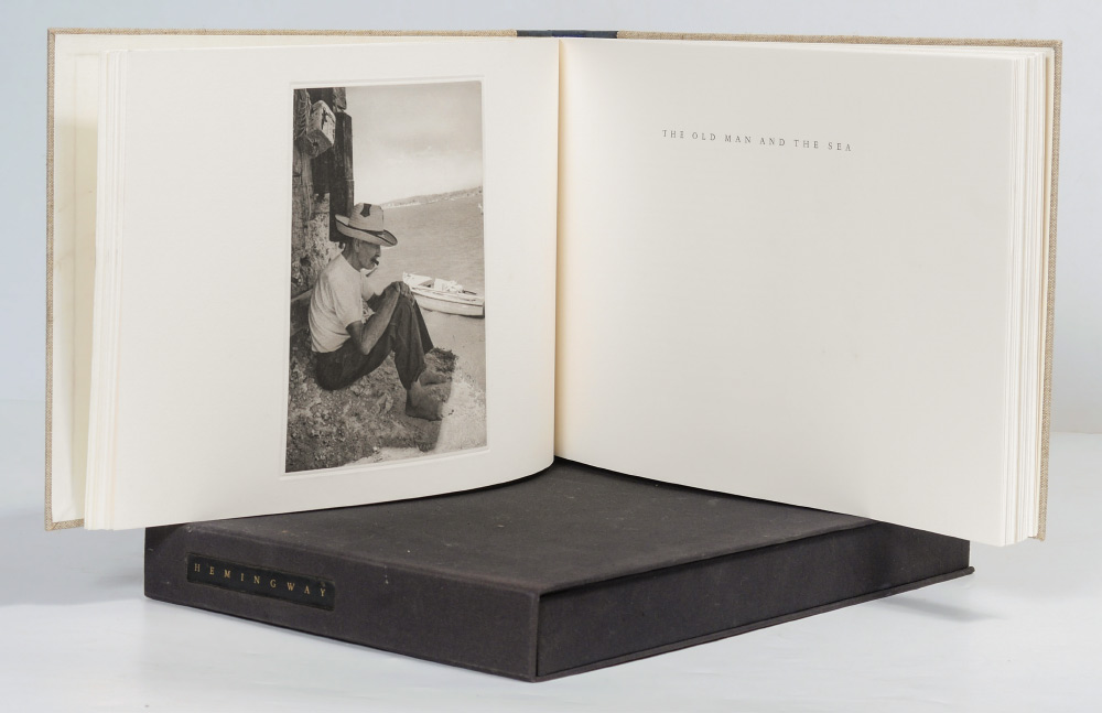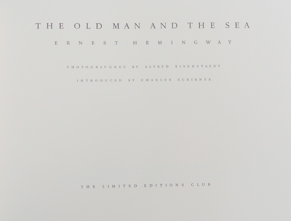 LIMITED EDITIONS CLUB HEMINGWAY THE OLD MAN AND THE SEA: Folio size with cloth covers, embossed leather spine, published 1990 by The Limited Editions club. This edition with photogravures and signed by Hemingway's private photographer Alfred Eisenstadt and numbered 241. With original folio case 12 1/4'' x 16 1/4'' x 2''.