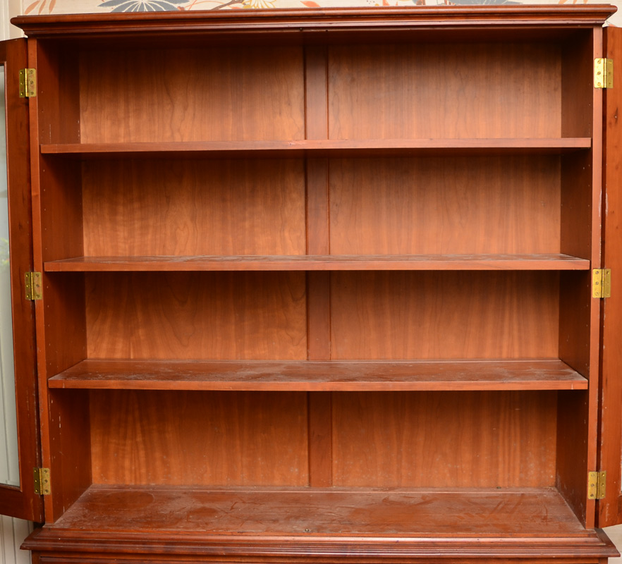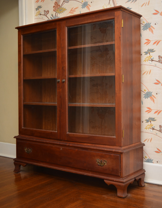 CHERRY BOOK CASE: 2 glass front doors, 3 wood shelves over single full length drawer, on 4 shaped feet. Overall measures 63'' x 54'' x 16''.