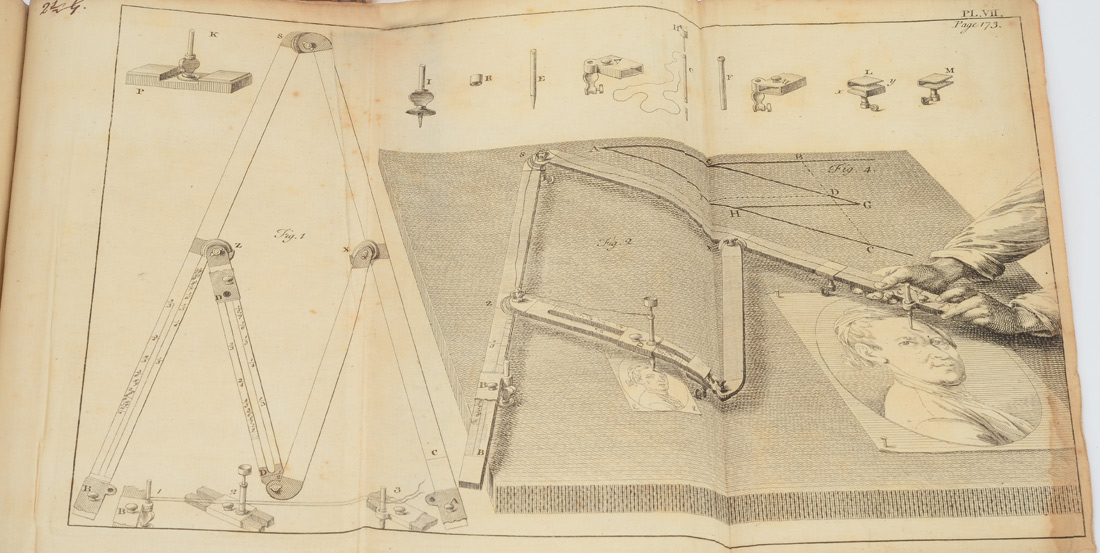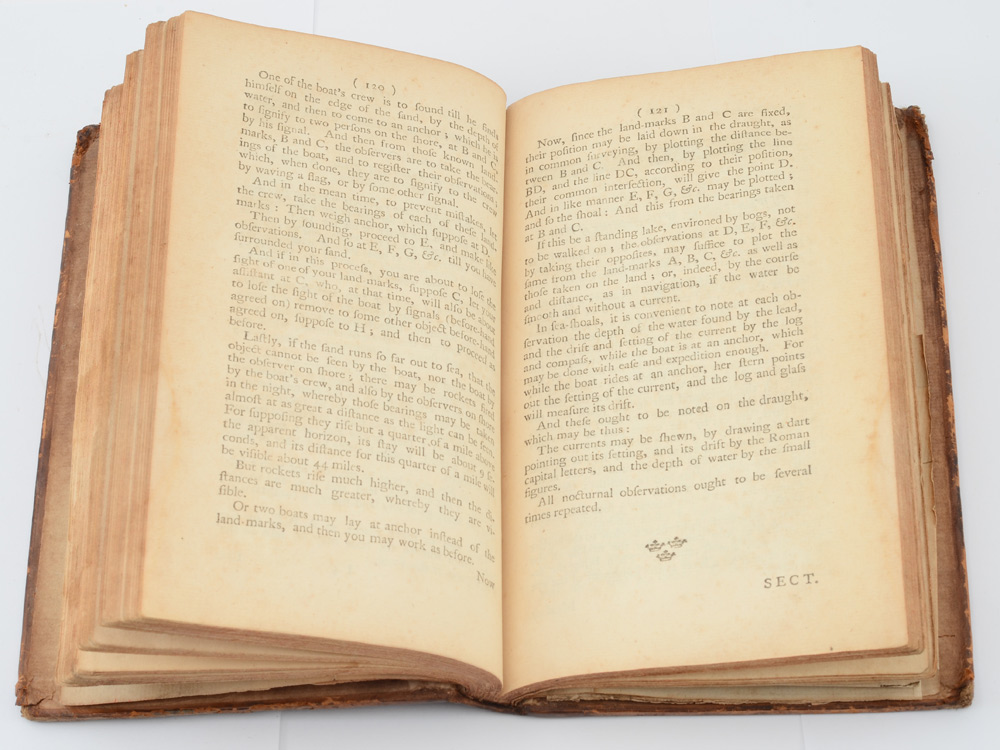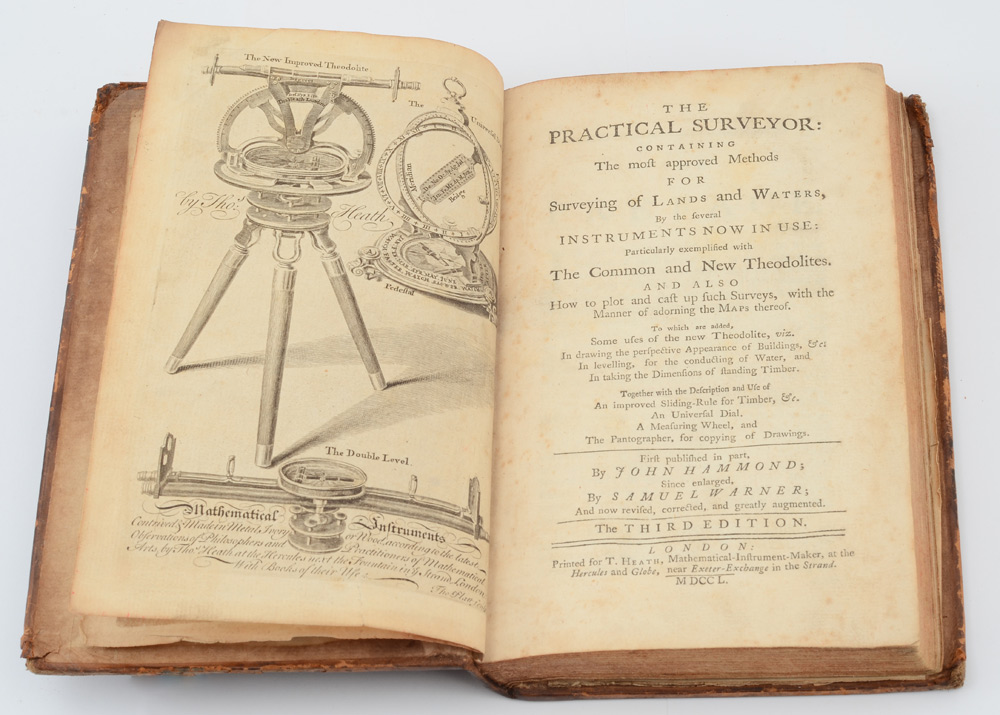 1750 THE PRACTICAL SURVEYOR BOOK: ''The Practical Surveyor: Containing the most approached methods for surveying of lands and waters,....'' 1750, First published by John Hammond, since enlarged by Samuel Warner, Third Edition, Printed for T. Heath, London. 182 pages, fold out panels, engraved frontice piece, full calfskin covers. 8 1/2'' x 5 1/4''.