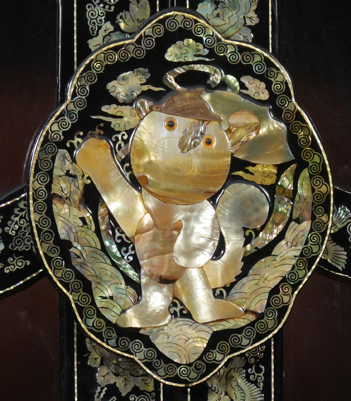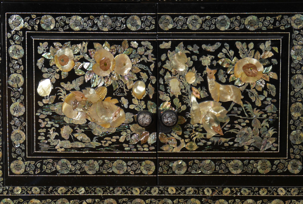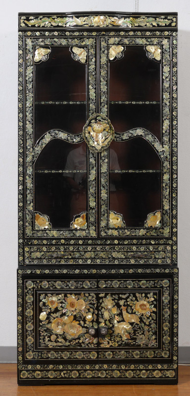 1988 KOREAN OLYMPICS COMMEMORATIVE INLAID CABINET: Profusely inlaid all over with faux mother of pearl decoration to include center medallion on door featuring Hodori, the mascot of the 1988 Summer Olympic in Seoul, South Korea. Other decoration includes butterflies, birds and floral decoration. Illuminated 2 glass door top with 3 glass shelves over drawer over 2 door base. Overall measures 79'' h. x 34'' x 18''. See similar and identical cabinets' previous 2 lots.