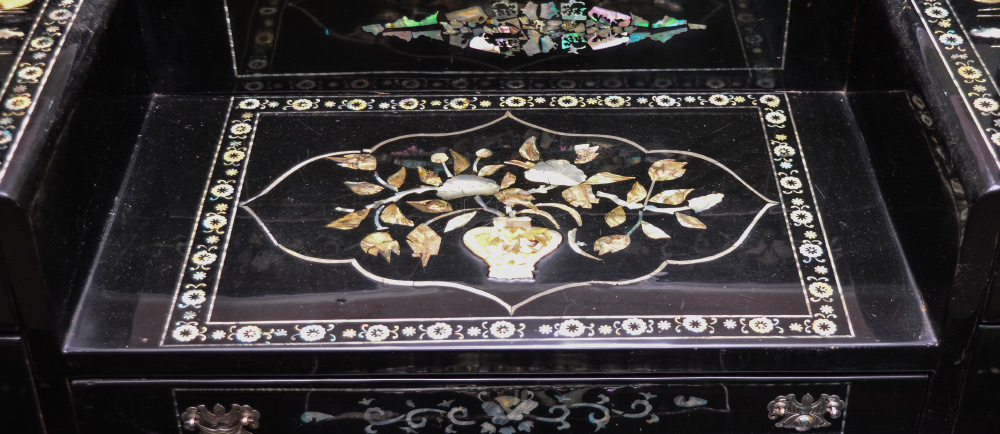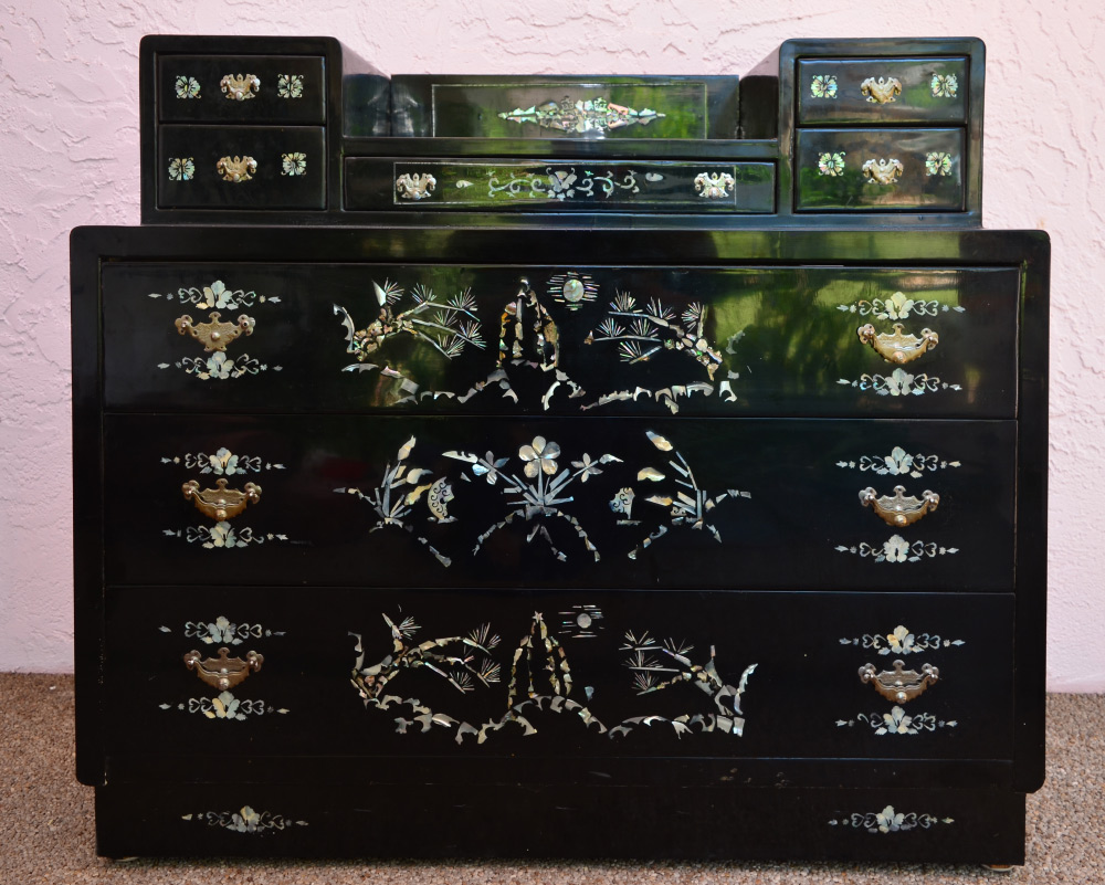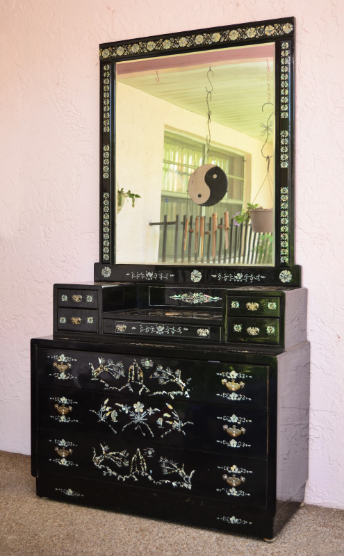 KOREAN INLAID DRESSER & MIRROR: Inlaid with mother of pearl and stone decoration all over, top with central drawer surmounted by 2 drawers either side over 3 full length drawers. 35'' h. x 40 1/4'' x 17 1/2''. Sold with matching wall mirror, 41 1/2'' h. x 35'' x 1 1/2''.