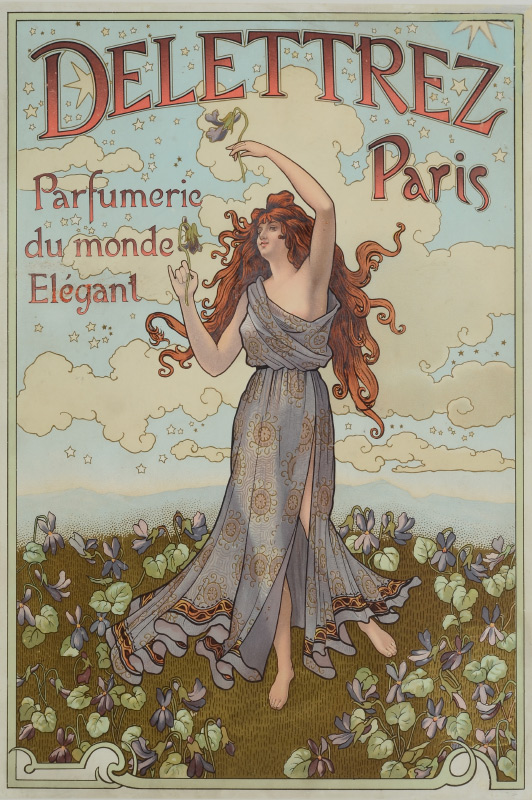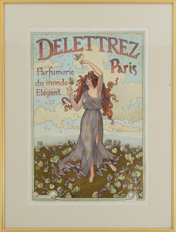 NOUVEAU POSTER FOR DELETTREZ PERFUME: Scene depicts a young nouveau maiden in a landscape with flower blossoms, Lithograph, 16 1/2'' x 11 1/4'', text reads ''Delettrez Paris Parfumerie du Monde ELEGANT'', contemporary frame, 22 1/4'' x 17''.
