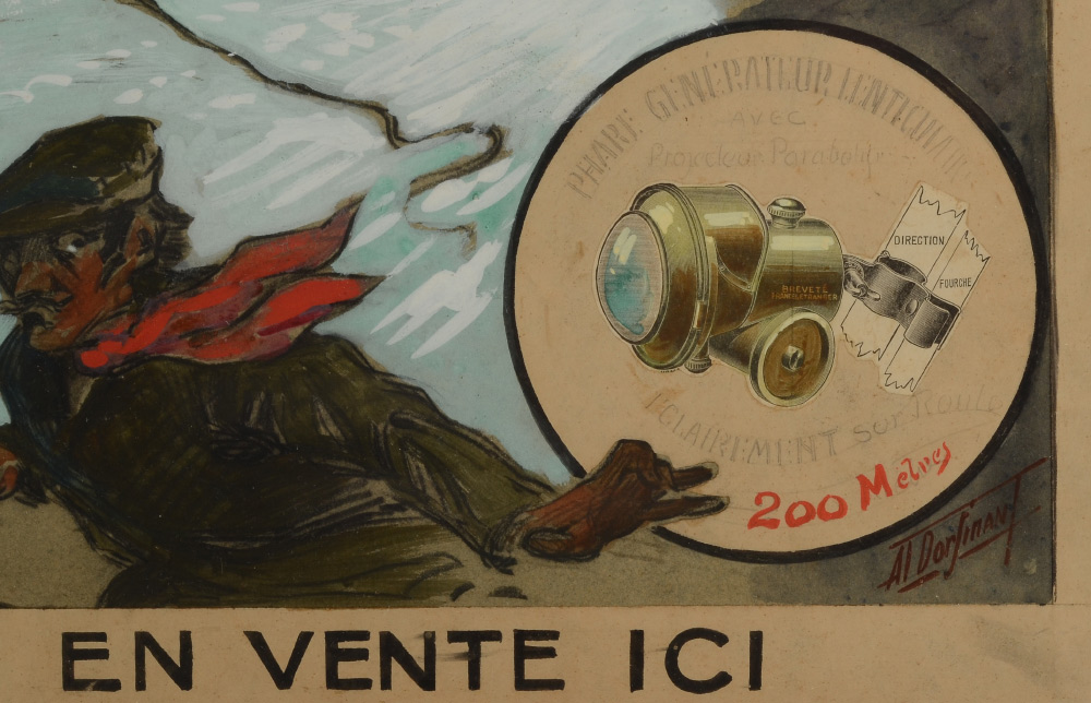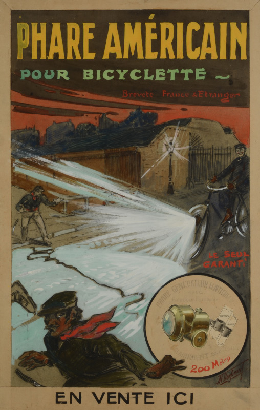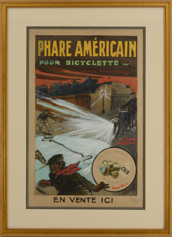 DORFINANT, Albert, (French, 1881-1976): ''Phare Americain Pour Bicyclette'', Illustration for bicycle headlamps, Pencil/Watercolor/Gouache, sight size 19 1/4'' x 12 1/4'', signed lower right, framed, 26'' x 18 3/4'', (poster maquette).