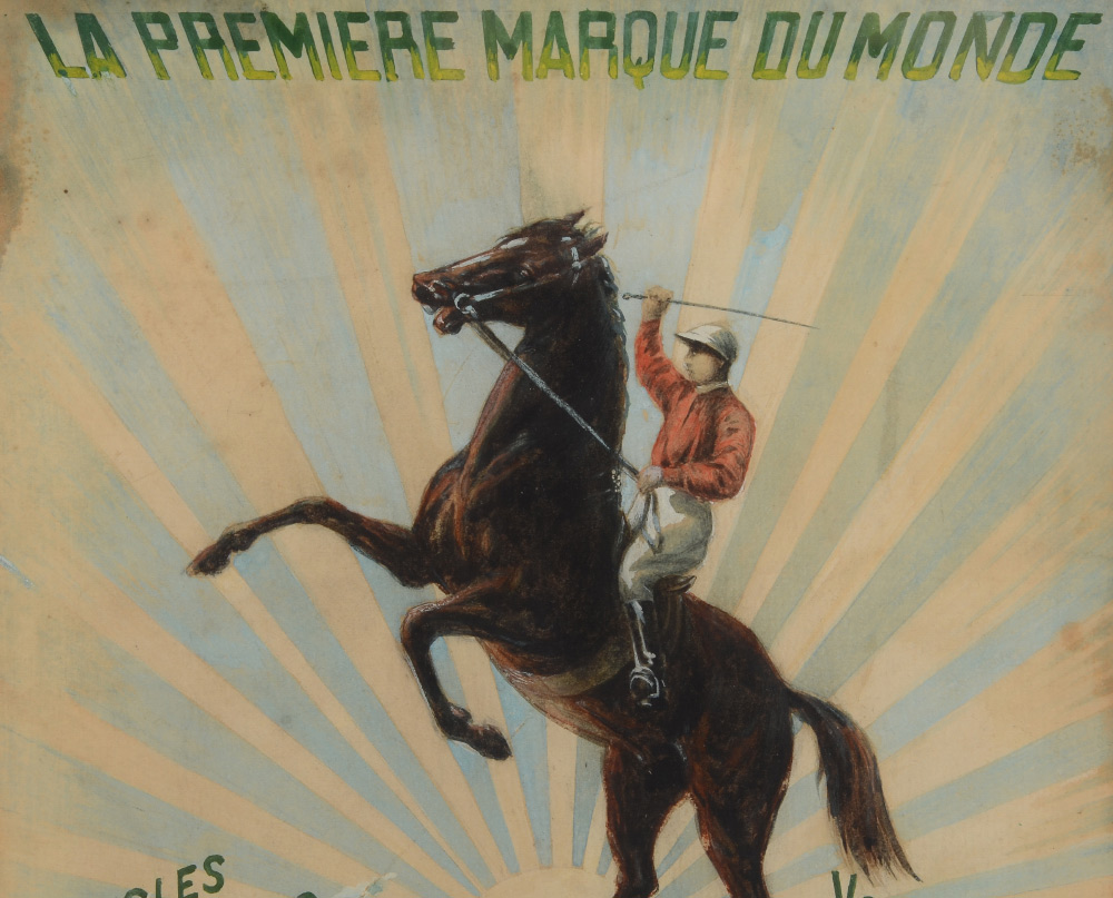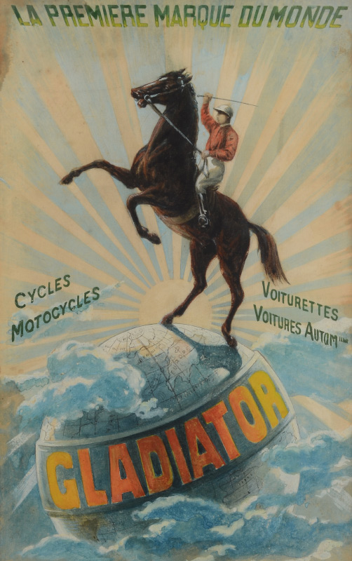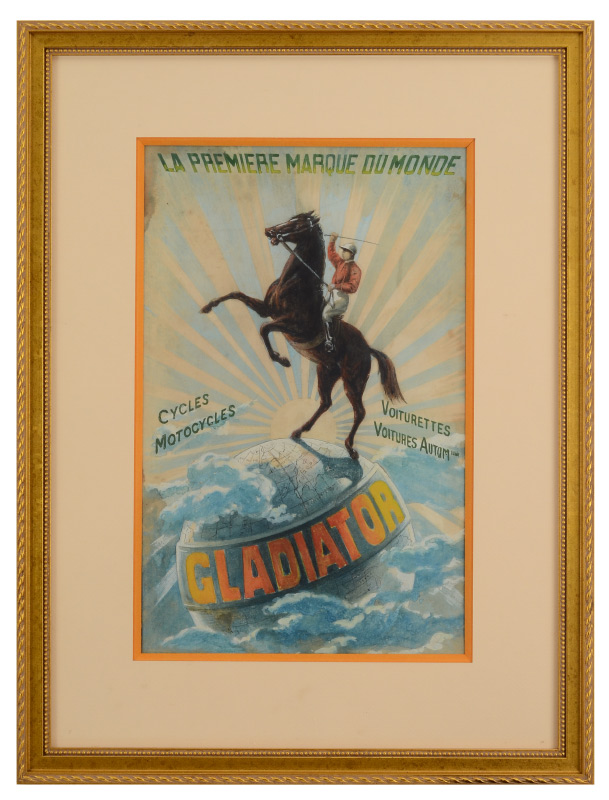 ORIGINAL FRENCH ILLUSTRATION FOR GLADIATOR BICYCLES AND MOTORCYCLES: Pen/Ink and Watercolor, sight size 11 3/4'' x 11 1/2'', no visible signature, text reads ''La Premiere Marque du Monde'', contemporary frame, 18 1/2'' x 13 1/2'', (poster maquette).