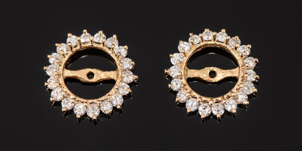 DIAMOND EARRING JACKETS: Fit beautifully with previous lot 1127. 14K yellow gold earring jackets contain 36 round brilliant cut diamonds totaling approx. 1.00 Ct., Rated VS in clarity and H-I in color. The diamonds are prong set. Weight: 3.6 grams.