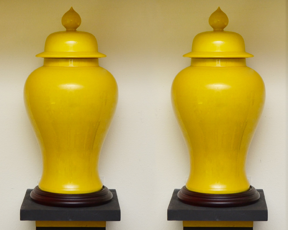 PAIR CHINESE YELLOW GLAZED JARS: Baluster form jars with lids, unmarked, overall 14 1/4'' h. x 7''. Sold with wood stands, 1'' x 6 1/2''.