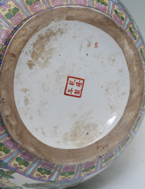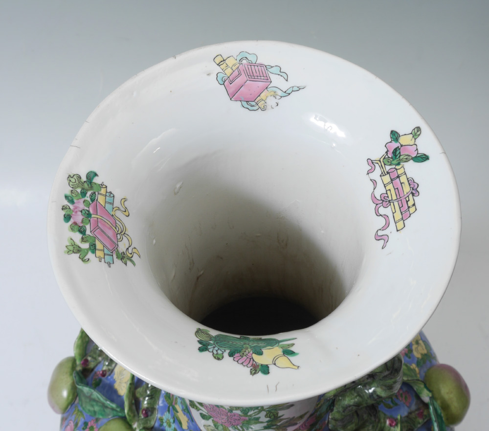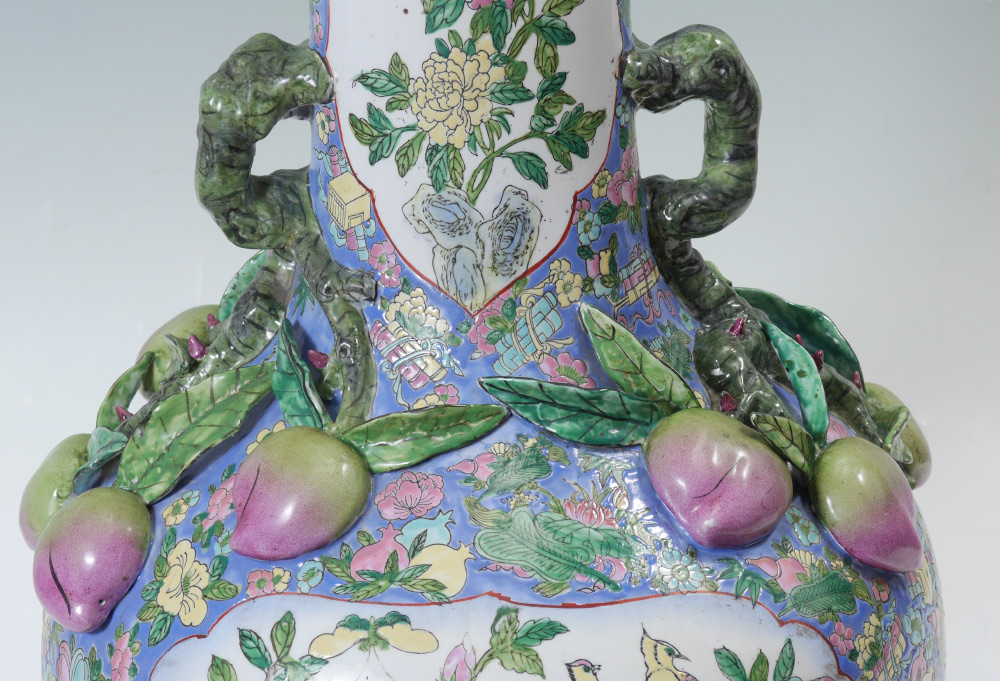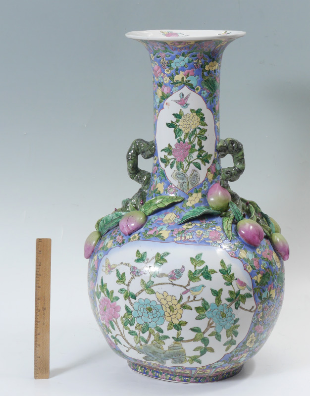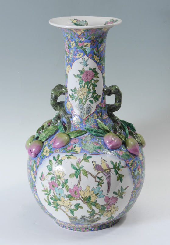 POLYCHROME CHINESE CERAMIC VASE: 29'' tall with handles in the form of branches and full body plums on the shoulders. Marked in character on the underside.