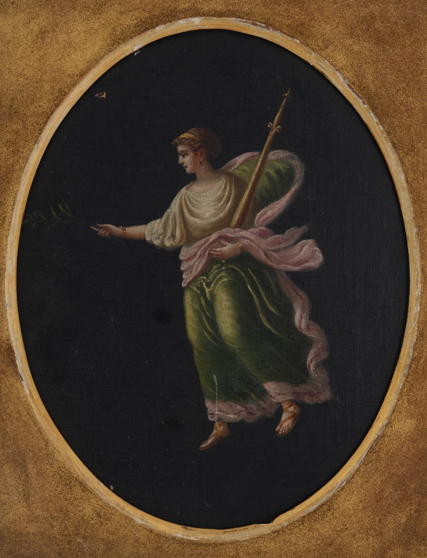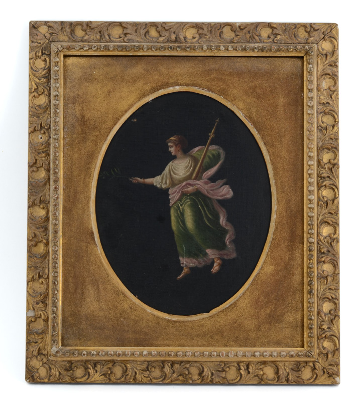 19th CENTURY RELIGIOUS PAINTING: Oil/Canvas Stretched Over Wood, depicts an angel? with extended branch, holding a staff, oval sight size 9 1/2'' x 7 1/4'', no visible signature, gilded gesso frame, 15 1/2'' x 13 1/4''.