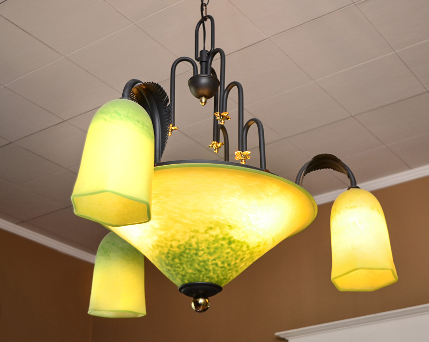 ITALIAN GLASS LIGHT FIXTURE: Mottled graduating green to gold shaded Italian glass on black and gold iron hanging light, purchased by consignor 1980 in Florence Italy, overall approx. 28'' h. x 26'' dia.