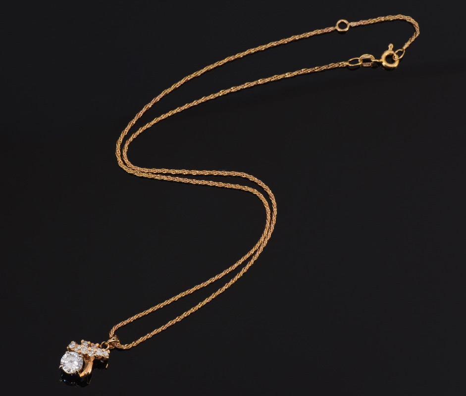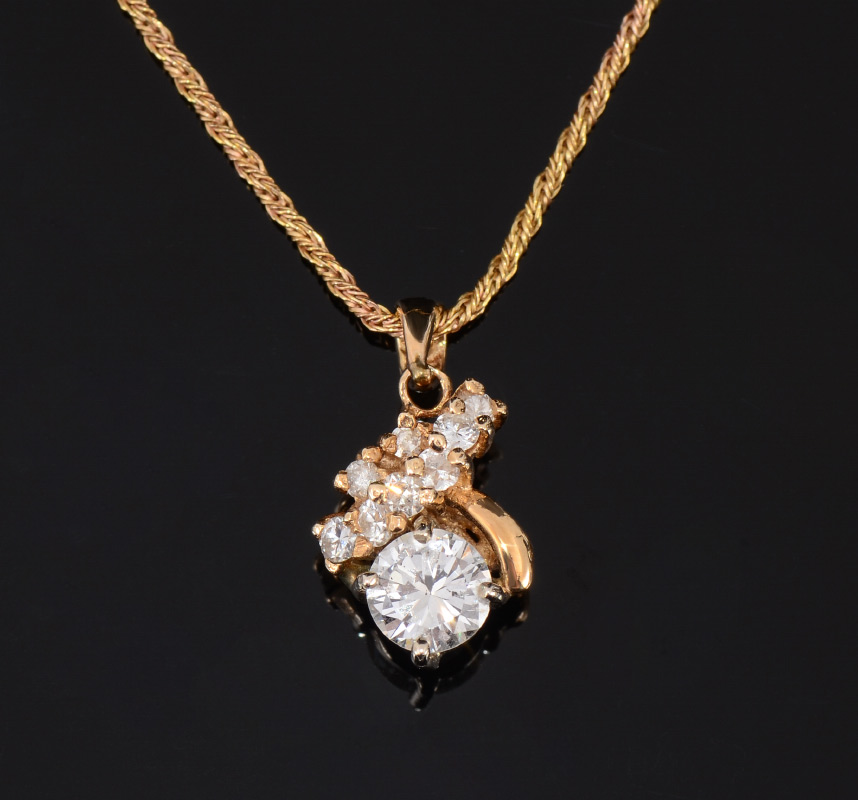 ESTATE DIAMOND PENDANT NECKLACE: 14K yellow gold pendant contains one round brilliant cut diamond, .63 Ct., rated SI2 in clarity and H in color, accented with 8 round full cut diamonds. totaling approx. .25 Ct. rated VS-SI in clarity and H-I in color. Total weight: .88 Ct. Approx. The diamonds are prong set. Freeform nugget style. 14K yellow gold 18'' chain. Weight: 4.3 grams.